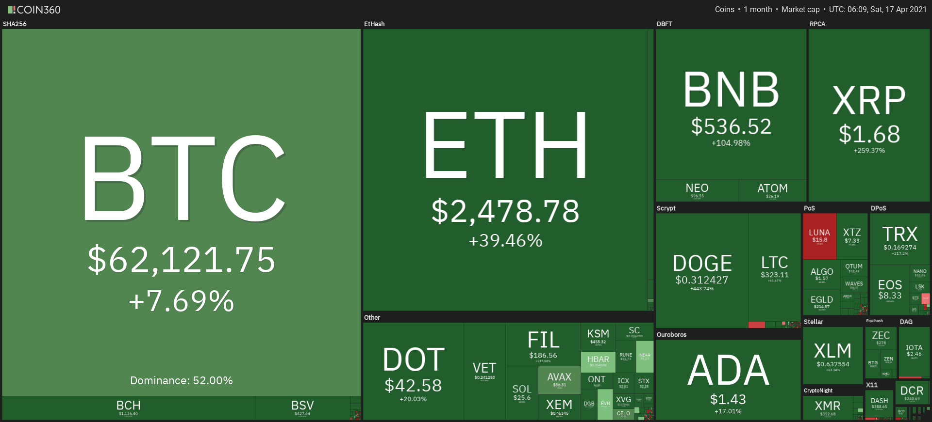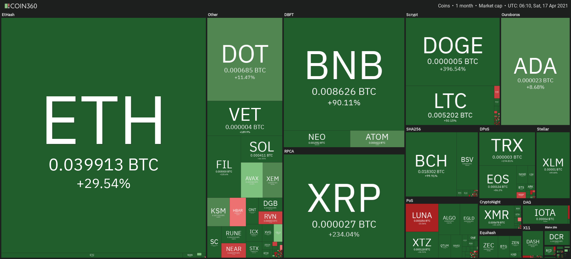 Nhìn vào thống kê từ Coin360 trong một tháng qua. Toàn một màu xanh rực rỡ.
