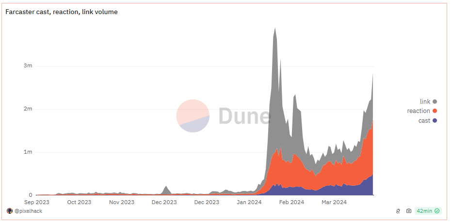 Dữ liệu Dune cho thấy, tổng số lượng nội dung bao gồm cast, reaction, link mỗi ngày trên Farcaster duy trì từ 1 triệu đến 3 triệu, nghĩa là gấp 100 lần so với mức trung bình của năm 2023. Không chỉ bùng nổ về lượng người dùng mới, nhưng Farcaster cũng bùng nổ về nội dung trên nền tảng.
