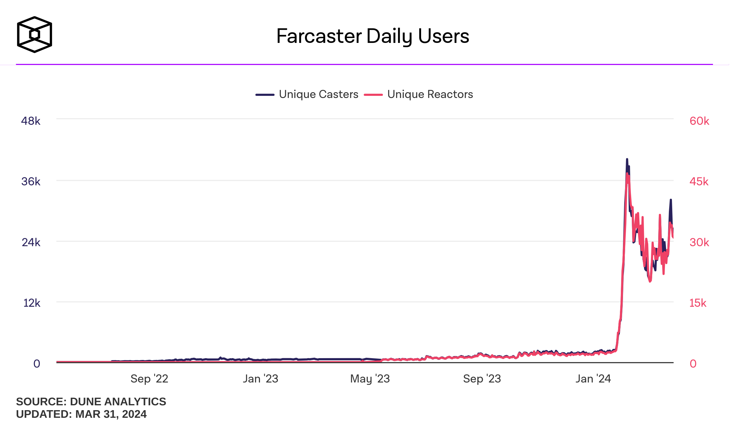 SponsoredLượng người dùng Farcaster bùng nổ đầu 2024, nhưng vẫn còn ít ỏi