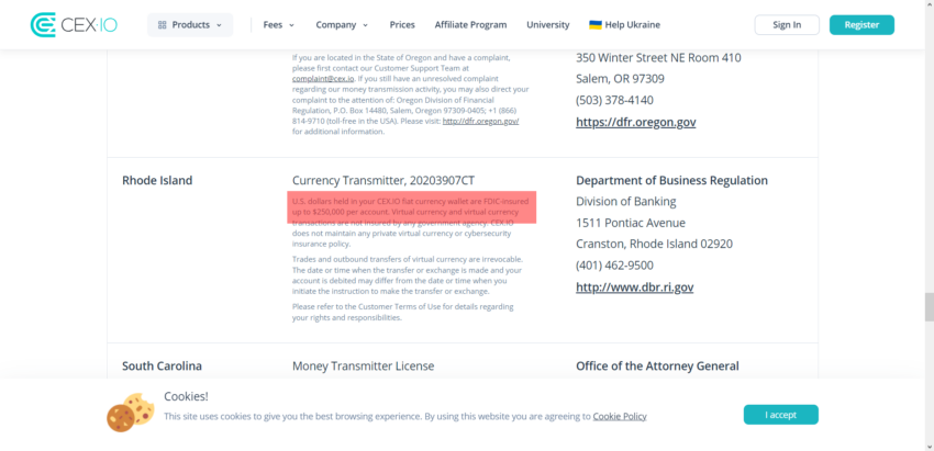 Sàn giao dịch tiền điện tử CEX.IO tuyên bố rằng đô la Mỹ (USD) trong tài khoản người dùng được bảo hiểm, nhưng cơ quan quản lý FDIC không đồng tình với tuyên bố này.