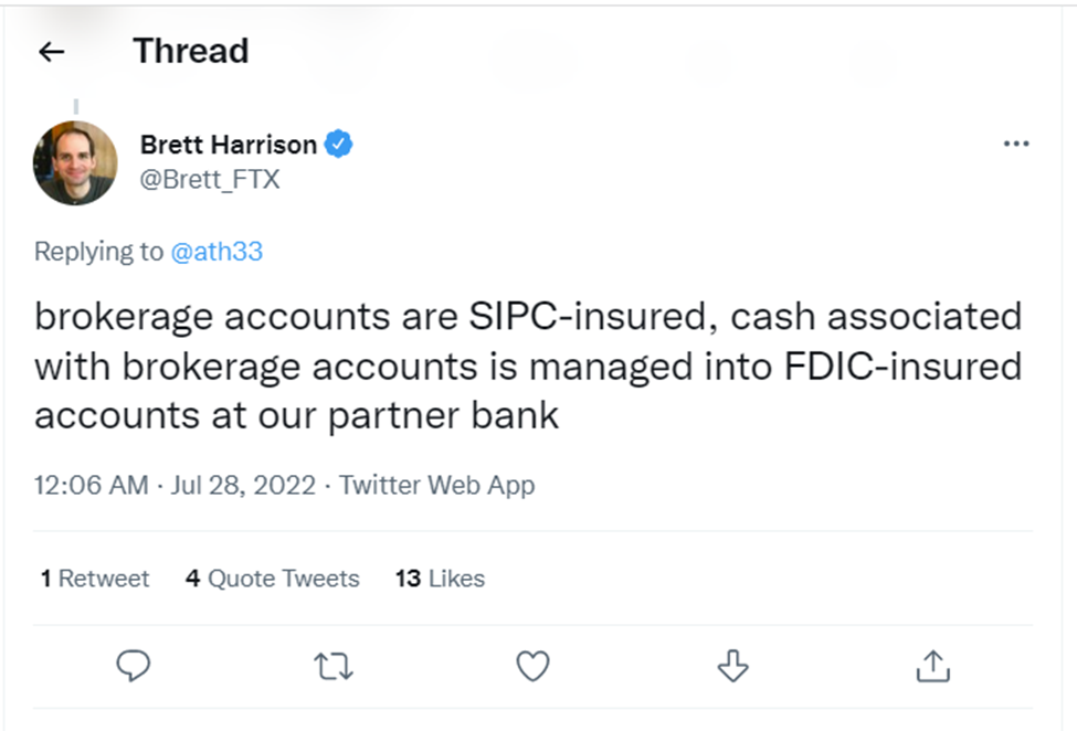Tuy nhiên, một đoạn tweet vào ngày 28/7 chia sẻ “tài khoản môi giới được bảo hiểm bởi SIPC” và “tiền mặt liên quan đến tài khoản môi giới được quản lý vào tài khoản được FDIC bảo hiểm tại ngân hàng đối tác” vẫn còn giữ nguyên. Trong lá thư từ FDIC cũng không yêu cầu xử lý phát ngôn này. Vì vậy, có nghi vấn cho rằng khoản tài sản từ FTX được bảo hiểm tại FDIC thông quan trung gian.