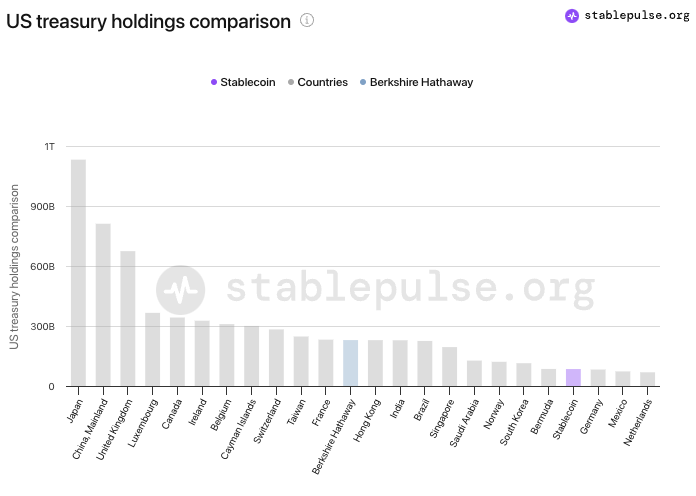Lợi nhuận ảnh hưởng là điều rất rõ ràng trong giai đoạn mới. Dựa trên các báo cáo xác nhận gần đây nhất, Tether đang nắm giữ gần 93.2 tỷ USD trái phiếu kho bạc Mỹ và các thỏa thuận mua lại, đóng góp phần lớn vào 5.2 tỷ USD lợi nhuận ròng trong nửa đầu năm 2024. Biểu đồ của stablepulse cho biết, Tether là thực thể nắm giữ trái phiếu kho bạc Mỹ lớn thứ 20 thế giới, vượt qua cả quy mô quốc gia như Đức, Mexico.