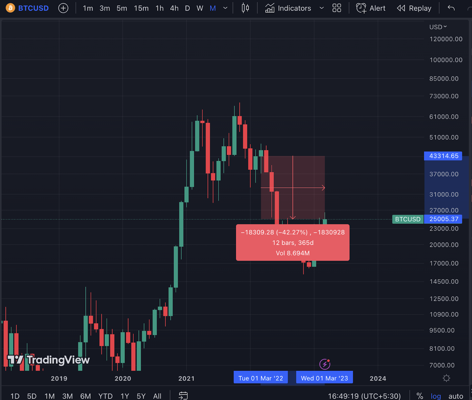 FED đã tăng lãi suất thêm 25 điểm cơ bản vào tháng 3/2022, lần đầu tiên kể từ năm 2008. Kể từ đó, FED đã ở trong chế độ siết chặt định lượng. Và giá của Bitcoin đã giảm hơn 42% kể từ tháng 3/2022.