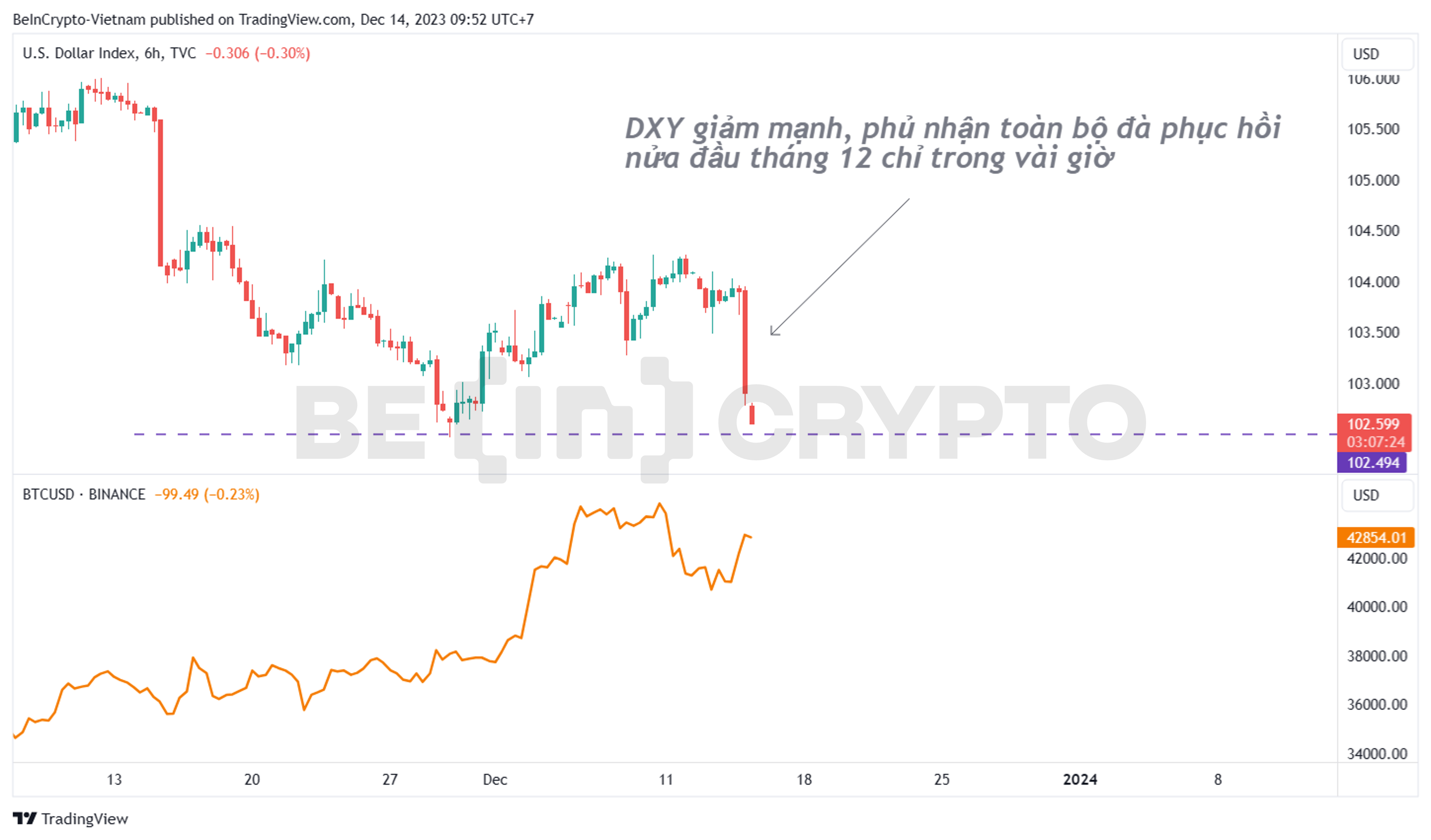 Sau khi thông tin dự kiến cắt giảm lãi suất trong năm 2024 được công bố, DXY đã giảm mạnh chỉ trong vài giờ và phủ nhận toàn bộ đà phục hồi của DXY từ đầu tháng 12 đến nay.