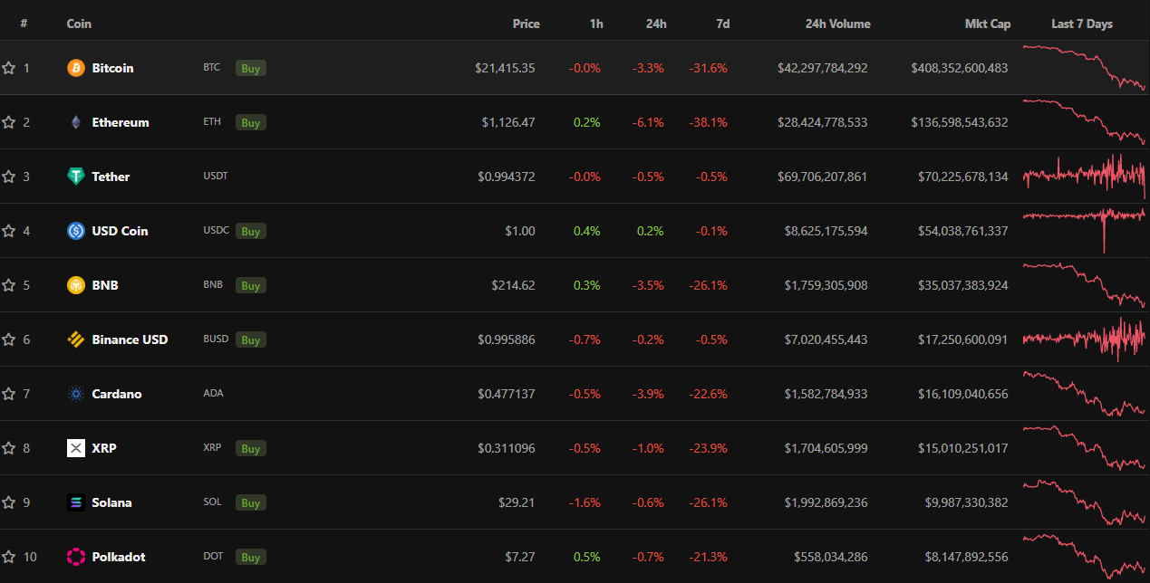 Theo dữ liệu BeInCrypto ghi nhận từ CNBC, tại thời điểm viết bài, chỉ số S&P 500 tăng hơn 34 điểm (0.9%); NASDAQ tăng 175 điểm (1.62%). Đáng buồn là thị trường Crypto nói riêng vẫn đang chìm trong sắc đỏ. Ghi nhận của BeInCrypto tại thời điểm trước khi tỷ lệ lãi suất điều chỉnh được công bố, giá Bitcoin (BTC) ở mức 21,415 USD giảm 3.3% trong 24 giờ qua; Ethereum (ETH) mất 6.1% trong 24 giờ qua, về mốc 1,126 USD.