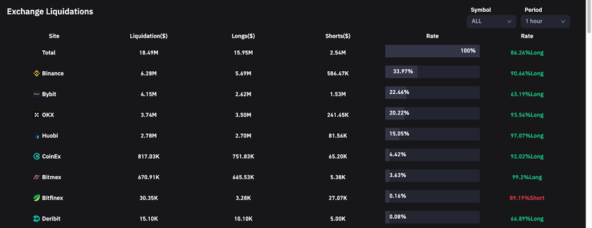 Theo dữ liệu từ Coinglass, các giao dịch trị giá hơn 18 triệu USD đã bị thanh lý trên các sàn giao dịch tiền điện tử trong 1 giờ sau thông báo FED tăng lãi suất 50 điểm cơ bản. Các nhà giao dịch đặt cược vào đà tăng giá của thị trường đã bị thanh lý với tỷ lệ đến 86.26% (tương đương 15.95 triệu USD) đã bị thanh lý.