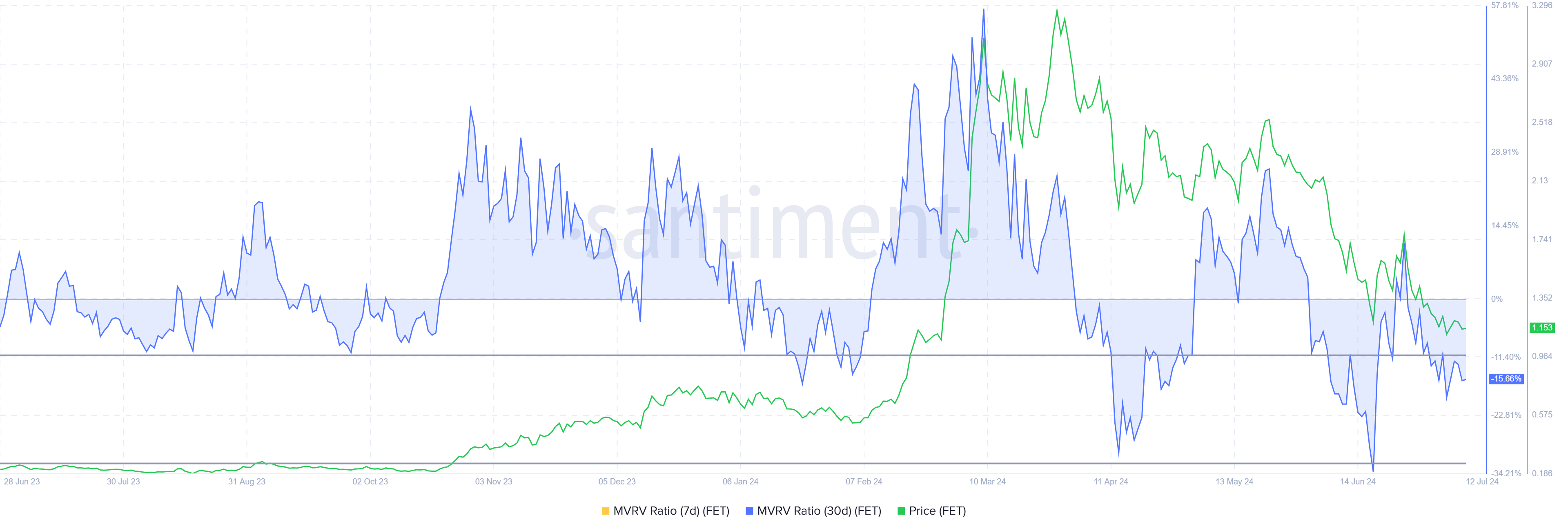 Tỷ lệ MVRV đo lường tình trạng lợi nhuận/thua lỗ của nhà đầu tư. MVRV 30 ngày của Fetch.ai đang ở mức -15% cho thấy tình trạng thua lỗ, nhưng là lúc khuyến khích để mua vào. Lịch sử cho thấy, MVRV của FET trong khoảng từ -10% đến -32% thường đi trước các đợt tăng giá, đánh dấu là khu vực cơ hội để tích lũy.