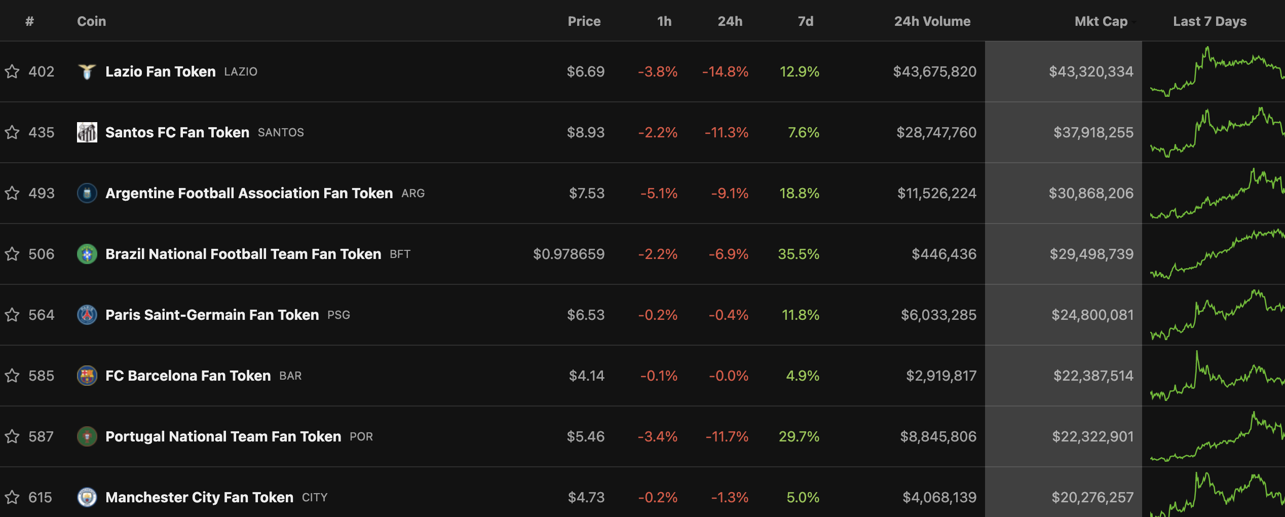 Theo ghi nhận của BeInCrypto với những dữ liệu được cung cấp bởi CoinGecko đã cho thấy giá fan token đều giảm mạnh trong 24 giờ qua. Thậm chí, giá một số fan token có vốn hoá lớn nhất như Lazio (~44 triệu USD); Santos FC (~37 triệu USD); Argentine (~30 triệu USD) đều chứng kiến mức giảm đến 2 con số trong 24 giờ.