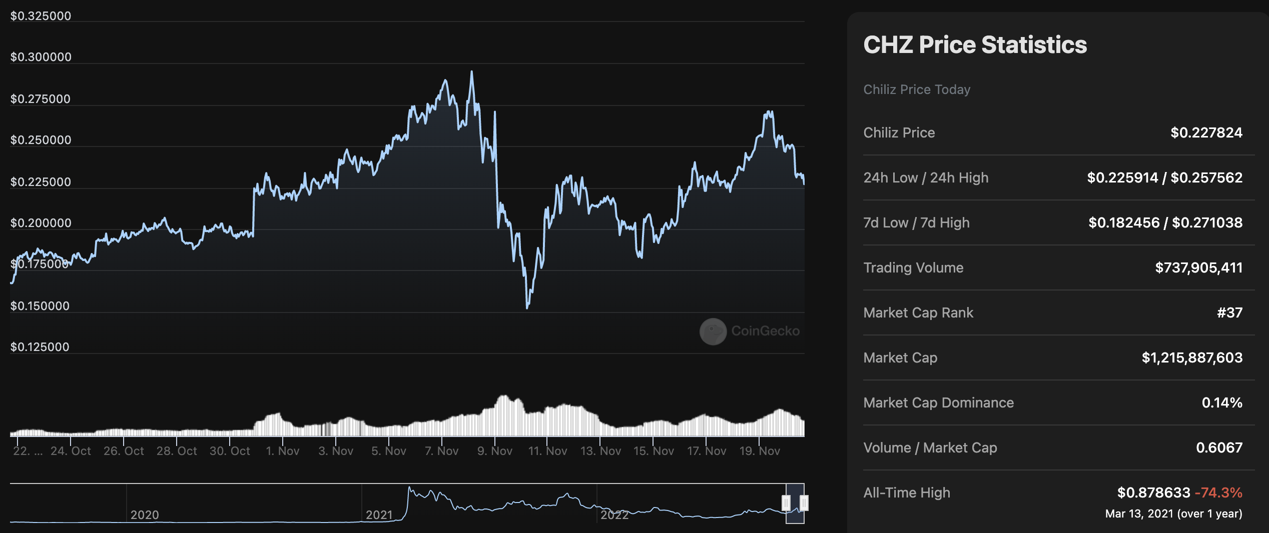So sánh với thời điểm sự cố xảy ra với FTX, giá CHZ đã có những chuyển biến tích cực. Ảnh hưởng chung từ thị trường, giá token CHZ thời điểm đó đã bị đẩy xuống mức chỉ còn khoảng 0.151 USD. Tuy nhiên, giá sau đó đã phục hồi lại lên mức 0.26 USD trước khi giảm trở lại vùng giá như hiện tại.