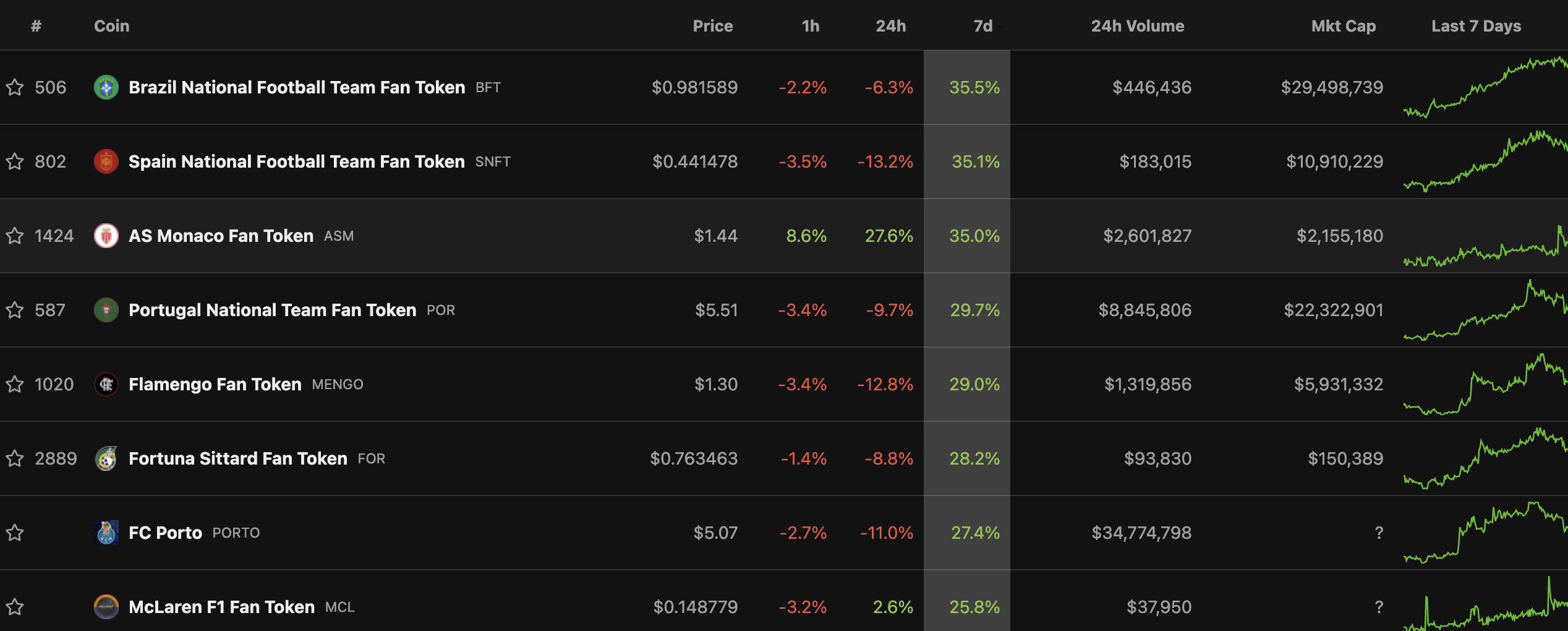 Tuy nhiên, nếu xét trong khung thời gian tuần, giá của một số fan token này vẫn cho thấy những tín hiệu lạc quan. Theo đó, phần lớn các loại fan token đều cho thấy tín hiệu tăng giá mạnh trong khung thời gian này. Giá fan token của một số đội bóng như Brazil (BFT), Spain (SNFT) hay AS Monaco (ASM) đã chứng kiến mức tăng hơn 35% trong 7 ngày qua.