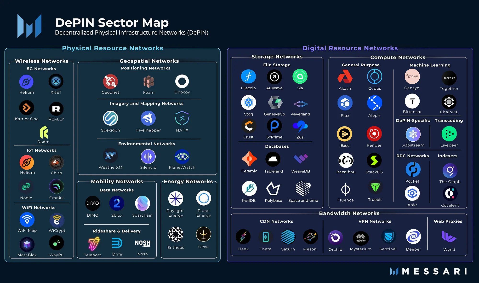 Khi mối quan tâm đến DePin tăng cao, mối quan tâm này sẽ dàn trải trên rất nhiều dự án ở khắp các lĩnh vực khác nhau hội tụ về. Thống kê của Messari gần đây cho thấy bức tranh ban đầu của không gian DePin như sau: