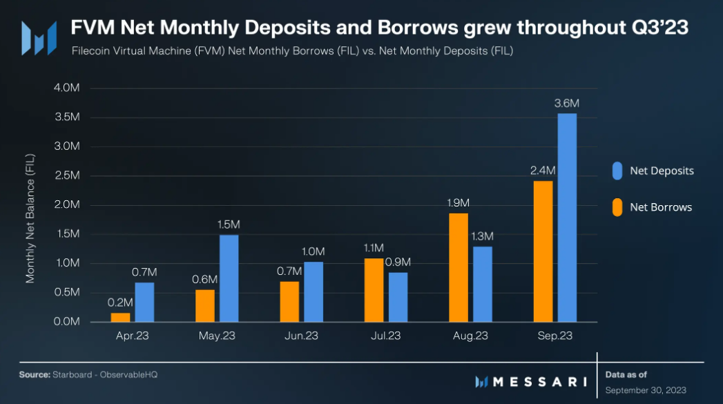 SponsoredBáo cáo từ Messari cho biết, tính đến ngày 30 tháng 9 năm 2023, hơn 2,000 hợp đồng đã được triển khai trên FVM và được sử dụng bởi hơn 560,000 người dùng, tạo ra hơn 1.6 triệu giao dịch. Tổng số tiền gửi ròng từ hơn 2,900 nhà đầu tư đạt gần 9 triệu FIL (khoảng 30 triệu USD) kể từ khi FVM ra mắt. Đồng thời, khoản vay ròng đạt 6.8 triệu FIL (gần 23 triệu USD). Trong quý vừa qua, cả tiền gửi ròng và tiền vay đều tăng trưởng bền vững.