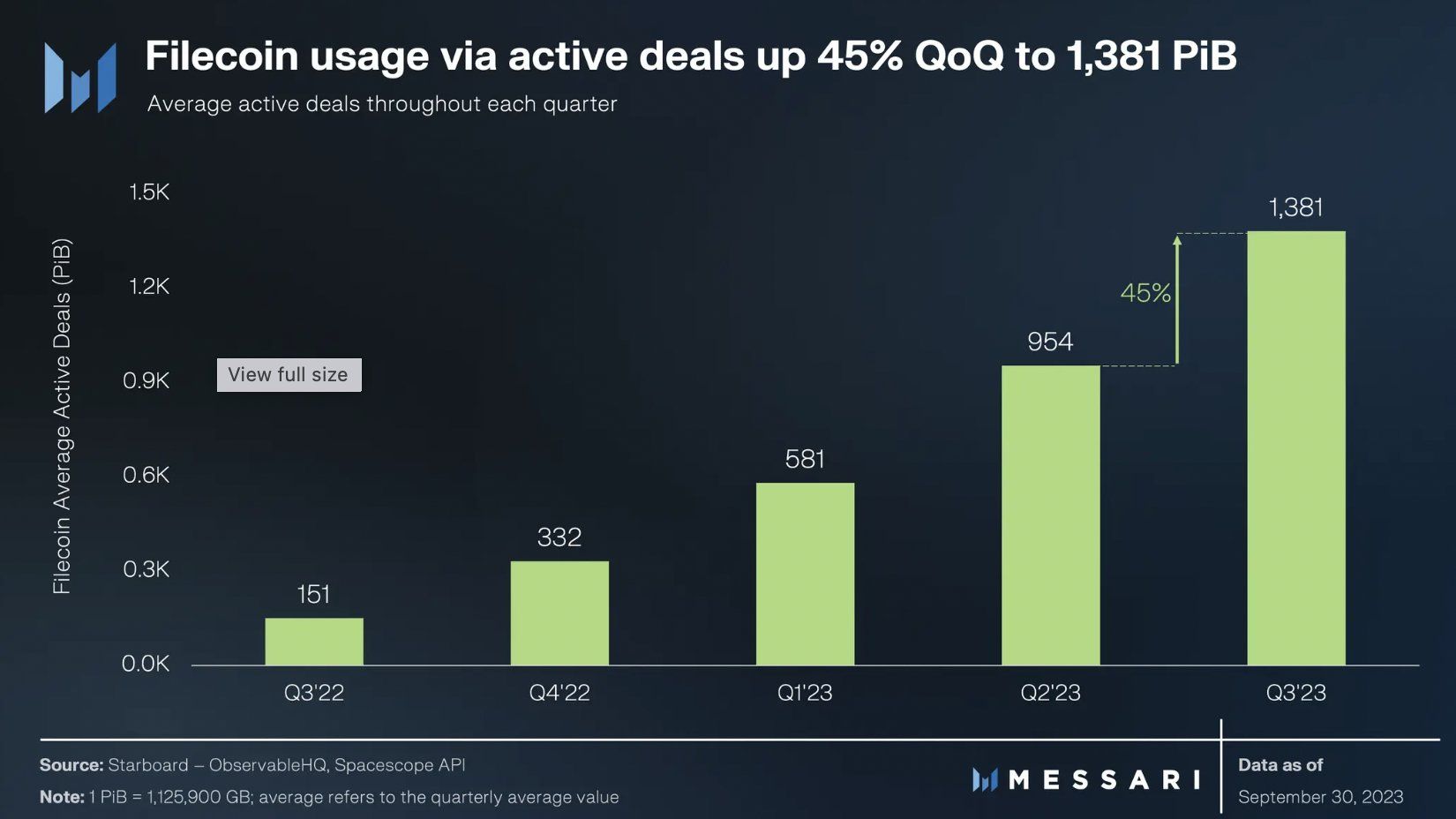 Sponsored SponsoredLượng dữ liệu được lưu trữ trong các storage deals (giữa người dùng lưu trữ và nhà cung cấp lưu trữ) vào cuối quý 3 là 1,381 PiB, tăng 45% so với quý 2. Lưu ý, 1 PiB tương đương hơn 1 triệu GB. Nếu tính từ cuối quý 3 năm 2022, thì đến nay dung lượng lưu trữ đã tăng gần 10 lần. Nhu cầu sử dụng giải pháp của Filecoin chính là minh chứng cho sức sống của dự án.