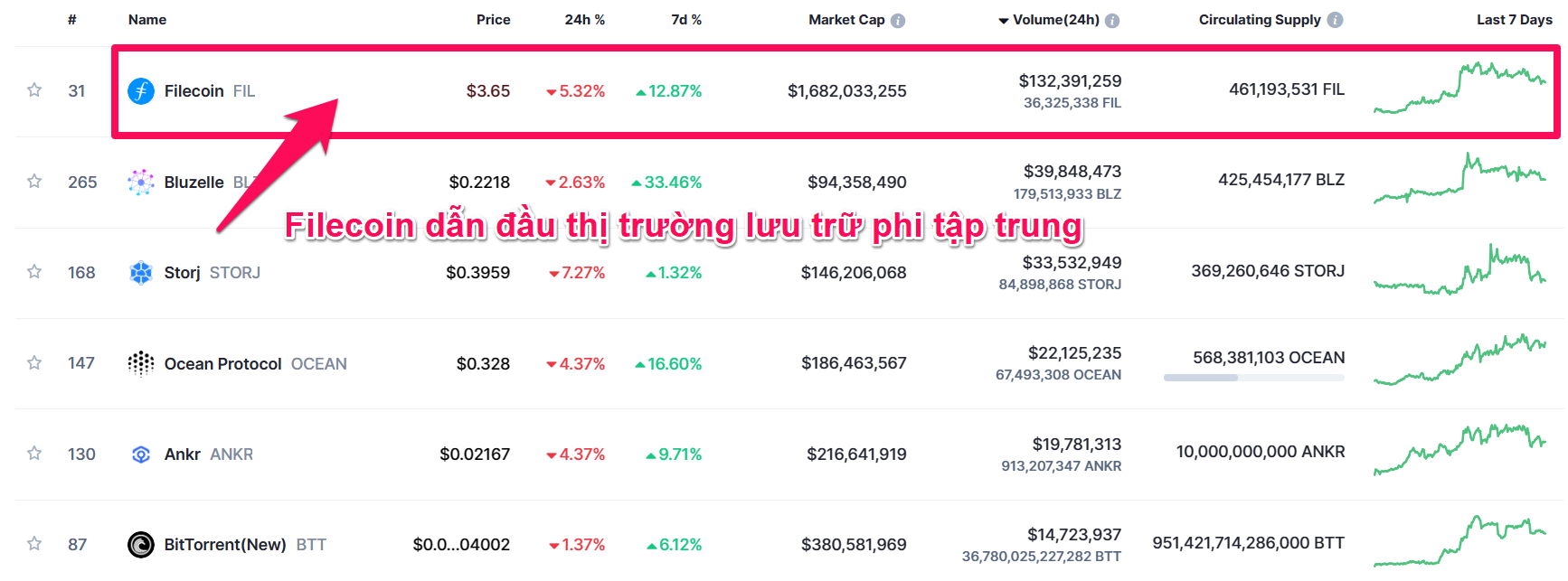 FIL vẫn là token hệ lưu trữ phi tập trung dẫn dầu về sức thanh khoản và giá, bỏ xa các đối thủ khác cũng nổi tiếng không kém là Storj (STORJ) và BitTorrent (BTT). Khối lượng giao dịch trong ngày của FIL gấp 4 lần STORJ và gấp 10 lần BTT.