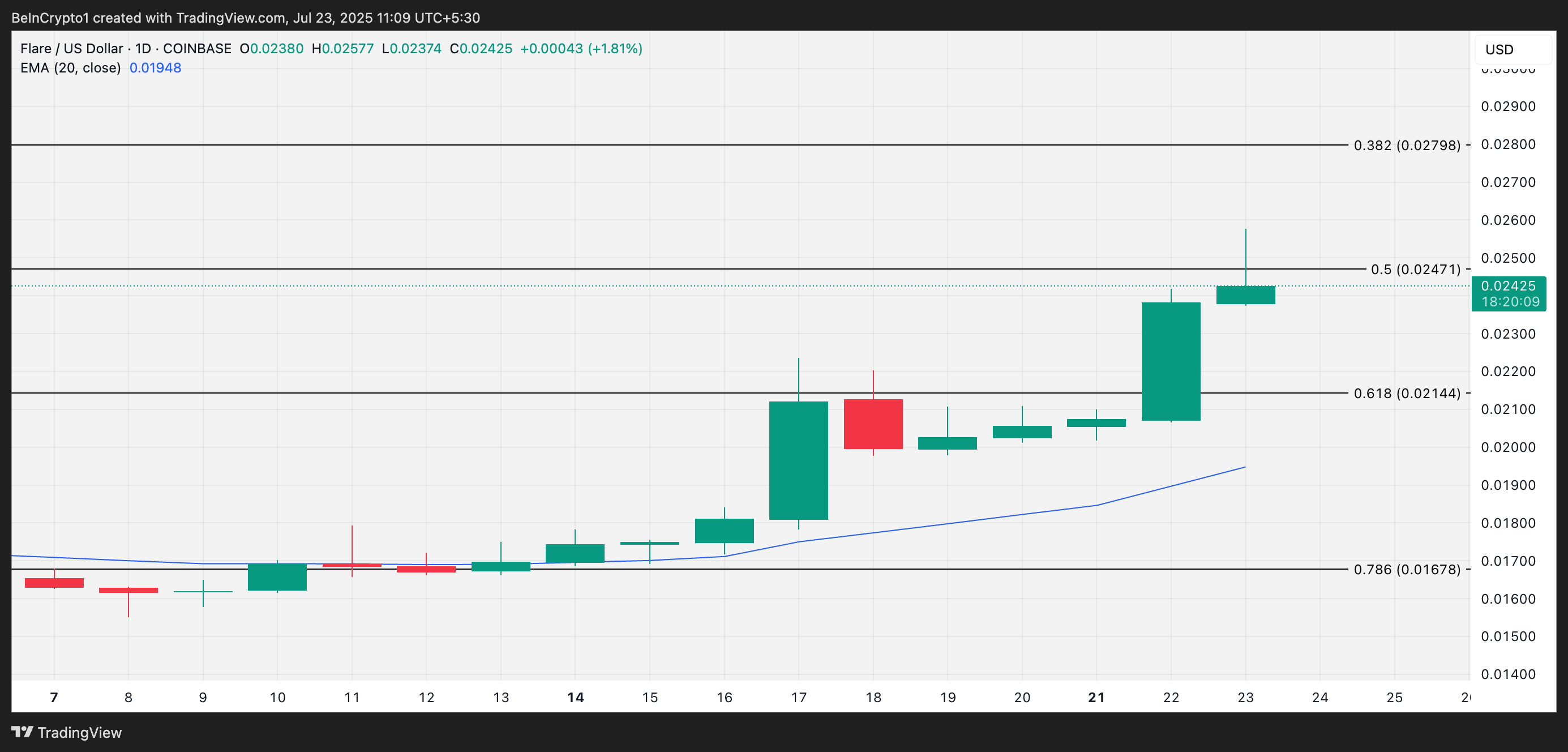 Tuy nhiên, bất kỳ sự gia tăng nào trong việc chốt lời có thể làm vô hiệu hóa thiết lập tăng giá này. Một sự từ chối ở các mức hiện tại có thể đưa giá quay lại 0.02144 USD, một vùng hỗ trợ quan trọng. Nếu mức sàn đó không giữ được, FLR có thể rút lui xa hơn về đường EMA 20 ngày của nó, nơi nó có thể cố gắng ổn định và lấy lại động lực.