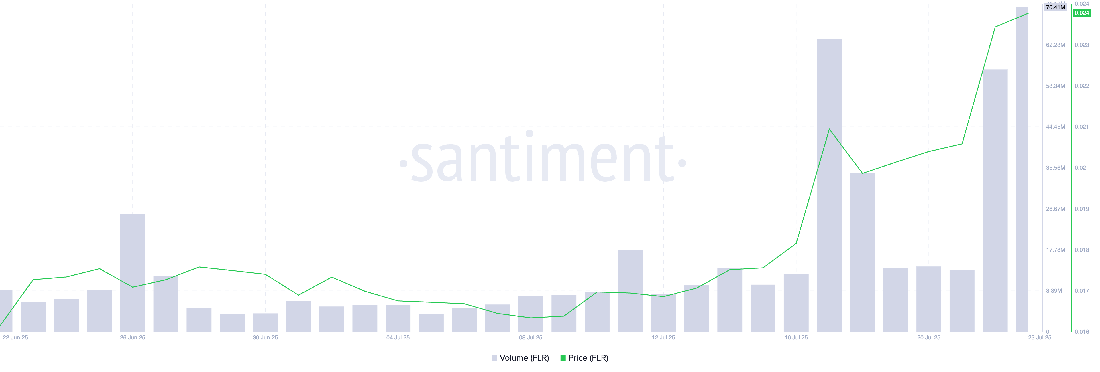 Khối lượng giao dịch của FLR đã tăng vọt hơn 300% trong ngày qua. Điều này cho thấy nhu cầu tăng cao và xác nhận làn sóng tăng giá hiện đang thúc đẩy hành động giá của nó. Tại thời điểm viết bài, khối lượng đạt tổng cộng 70.41 triệu USD, đánh dấu hoạt động giao dịch trong ngày cao nhất kể từ ngày 03/12/2024.