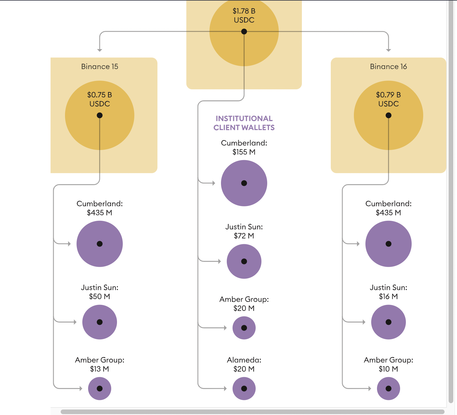Tuy nhiên, sàn giao dịch đã phá vỡ các quy tắc này vào ngày 17/8, khi rút 3.63 tỷ USD từ ví cố định của nó sang ví lạnh “Binance 8”. Sau đó, Binance đã trả lại 1.85 tỷ USD vào ví cố định nhưng lại chuyển 1.78 tỷ USD còn lại sang ví lạnh Binance 14. Sau đó, sàn giao dịch đã phân phối số tiền này cho một công ty thương mại, Cumberland, Amber Group, Alameda Research và người sáng lập Tron, Justin Sun.