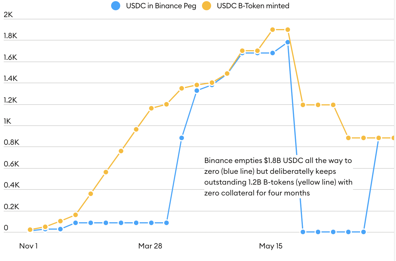 Khi Binance rút 1.78 tỷ USD USDC vào ngày 17/8, nó đã không giảm nguồn cung của B-USDC. Tài sản thế chấp giảm xuống 0 và sàn giao dịch đã để nó như vậy trong 4 tháng