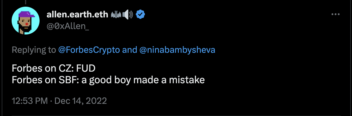 Tuy nhiên, cộng đồng đã chỉ ra rằng Forbes có vẻ đã “nương tay” với Sam Bankman-Fried, nhưng lại rất tích cực tạo FUD chống lại Changpeng Zhao. Năm ngoái, luật sư Irina Heaver đã tweet rằng Forbes đang báo cáo “những lời dối trá và thông tin sai lệch”. Ngoài ra, Zhao đã kiện Forbes vì tội phỉ báng và sau đó đã hủy bỏ vụ kiện vào năm 2020.