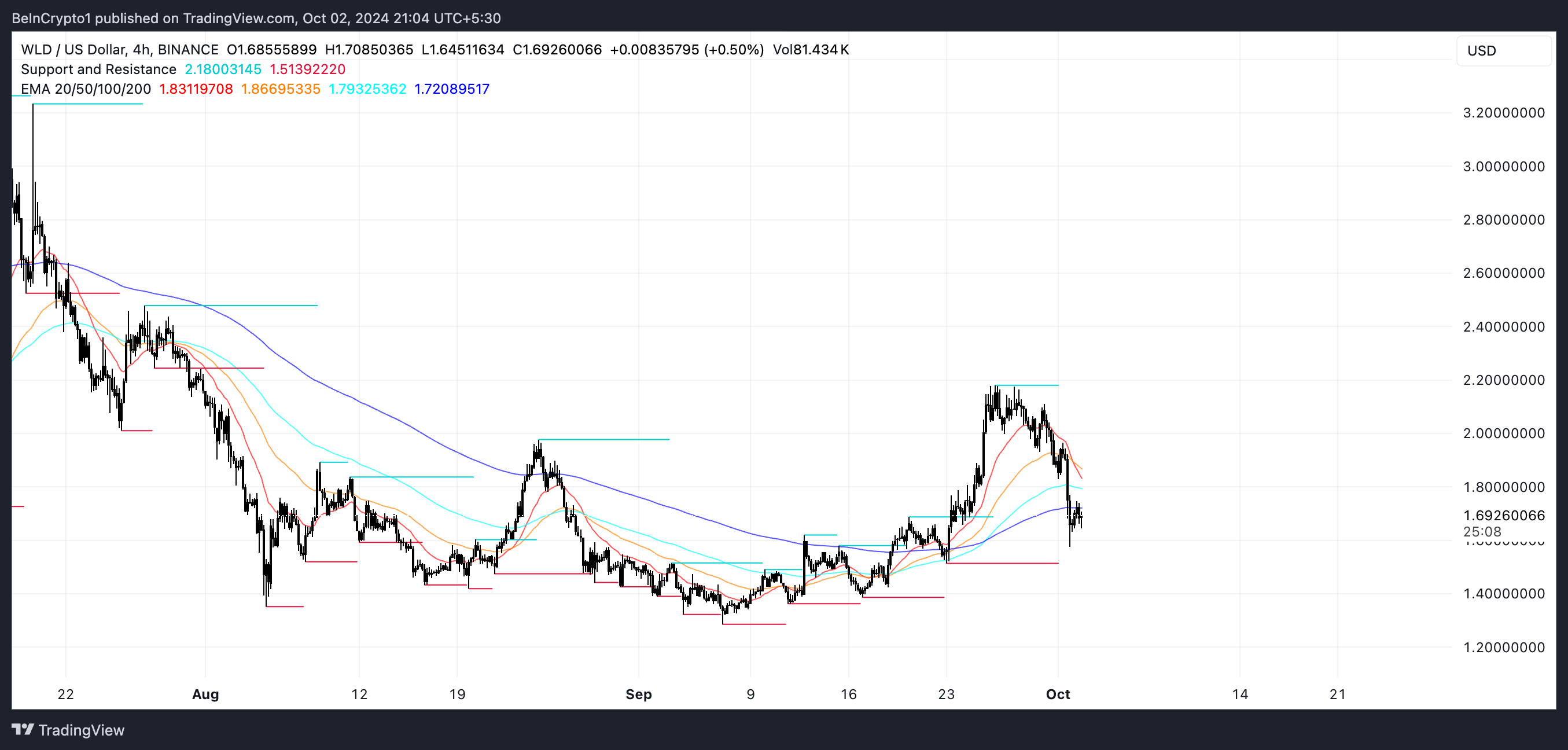 Tuy nhiên, nếu WLD có thể phục hồi, nó có thể thử các mức kháng cự tại 1.84 USD hoặc 1.98 USD. Nếu những mức này bị phá vỡ, nó có thể kích hoạt một đợt tăng giá lên đến 2.47 USD, đánh dấu mức giá cao nhất kể từ cuối tháng 7.