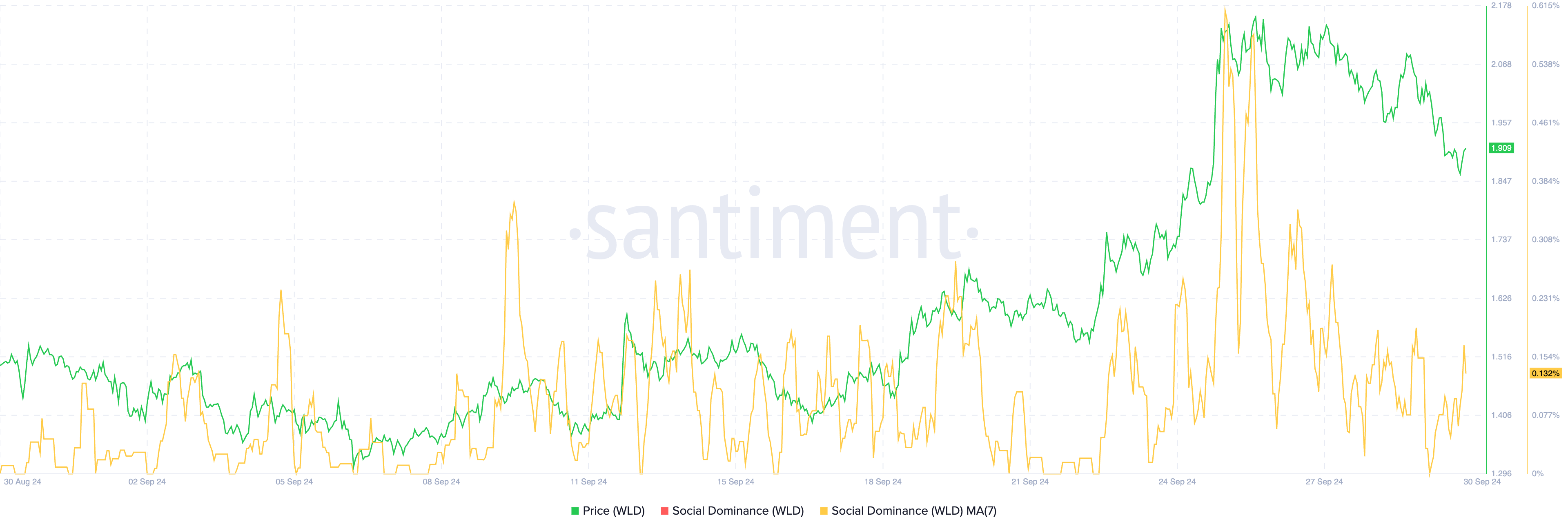 Chỉ số trung bình di động 7 ngày về sự thống trị trên mạng xã hội của WLD đã giảm xuống còn 0.132%, một sự đối lập rõ rệt so với mức 0.60% vào ngày 25/09. Đỉnh cao trước đó về sự thống trị trên mạng xã hội này trùng với đợt tăng giá của WLD lên đến 2.15 USD, đánh dấu mức cao nhất kể từ ngày 01/08.