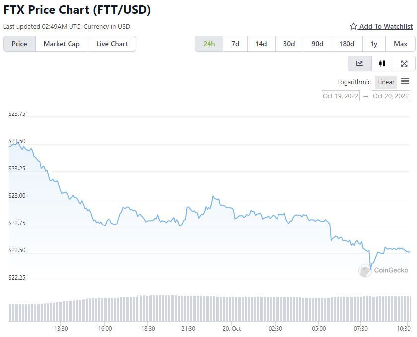 Mã thông báo gốc của sàn FTX do Sam Bankman-Fried làm chủ có vẻ không phản ứng tốt với tin tức mới nhất trong câu chuyện FTX mua lại Voyager đang diễn ra này. Theo ghi nhận của BeInCrypto, giá FTT đã mất 5% trong 24 giờ qua khi giảm xuống mức thấp nhất trong ngày là 22.35 USD vài giờ trước trong phiên giao dịch châu Á.