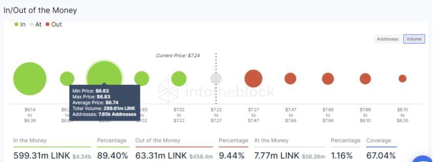 Một phân tích về giá của LINK cho thấy điều này là có thể. Thông tin chi tiết về mô hình IOMAP của IntoTheBlock cho thấy rằng hơn 7,500 địa chỉ đã mua 290 triệu LINK khi giá giao dịch trong khoảng từ 6.63 USD đến 6.83 USD.