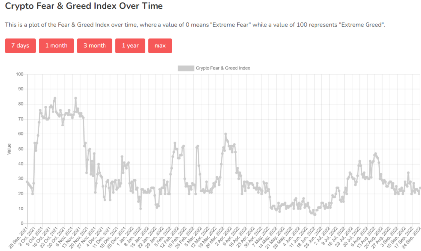 Theo chỉ số Tham lam & Sợ hãi (Fear & Greed), tâm lý thị trường hiện tại vẫn không thay đổi so với tháng trước. Chỉ số này hiện ở mức 24/100, với cảm xúc là “sợ hãi tột độ”. Chỉ số này chỉ đạt mức cao nhất là 60 vào năm 2022. Trong năm 2021, nó đã từng đạt 95 vào tháng 2 và 84 vào tháng 10.