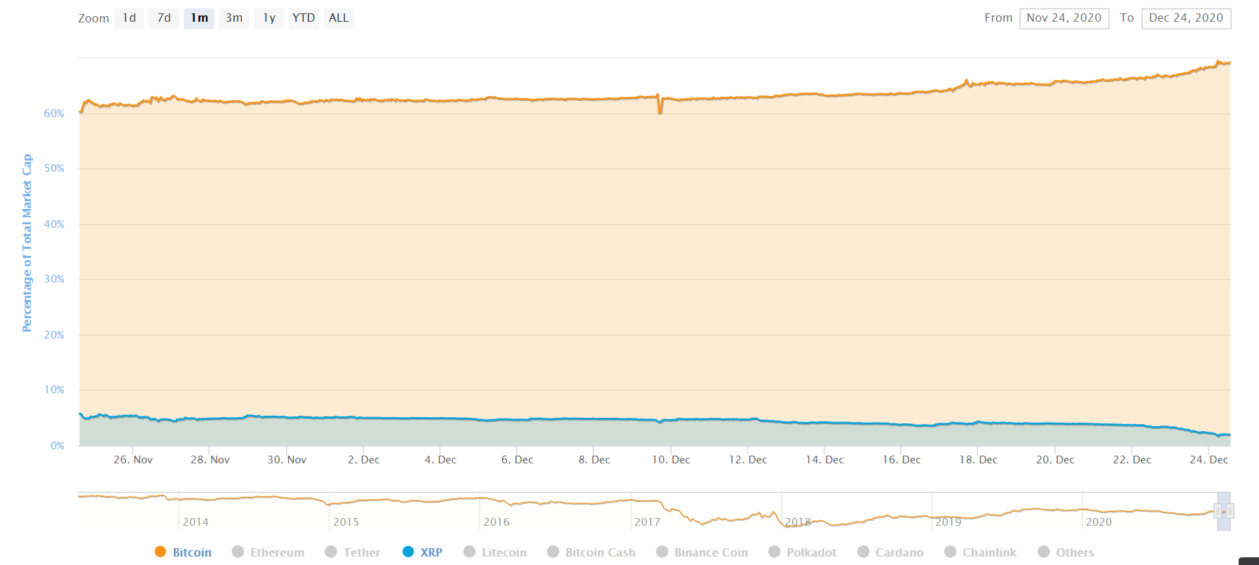 Tỷ lệ thống trị thị trường của Bitcoin đang tăng cao, trong khi XRP sụt giảm do vụ kiện của SEC. Theo đó, thị phần của Bitcoin hôm nay chạm ngưỡng 69,1%, mức cao nhất mọi thời gian.