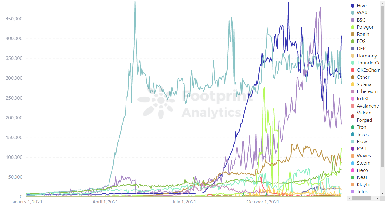 Đóng góp vào sự thành công chính của GameFi trong năm 2021, ngoài hai nền tảng chính là Binance Smart Chain (giờ là BNB Chain) và Ethereum ra, chúng ta còn chứng kiến sự góp mặt của 2 tên tuổi mới là Hive và WAX. Trong đó, Hive là một hệ sinh thái blockchain phi tập trung. Nhờ việc thêm chế độ PvP và cho phép khởi chạy token quản trị của game SplinterShards (SPS) vào tháng 8/2021 nó đã làm tăng khối lượng giao dịch của GameFi lên hơn 44 tỷ USD. Còn đối với WAX, nhờ khả năng mở rộng và phí gas rẻ hơn so với Ethereum mà nó có thể thu hút được nhiều người dùng so với các nền tảng khác.