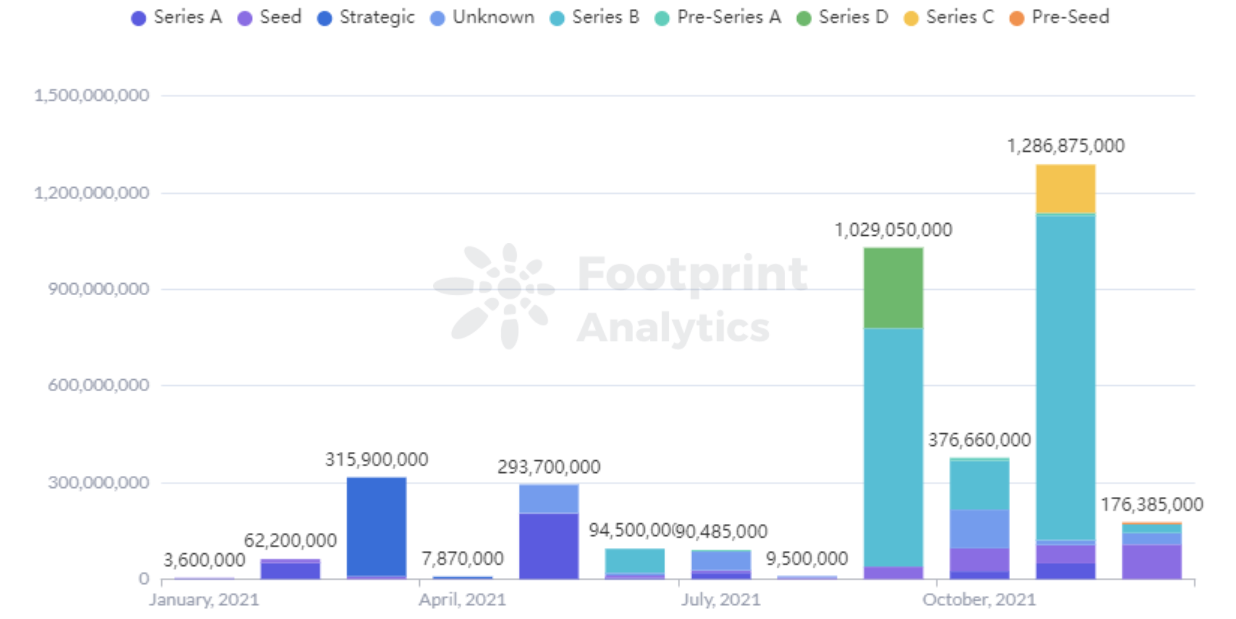 Trong 3 tháng cuối năm ghi nhận lần lượt là 33, 36 và 39 thương vụ gọi vốn thành công trong lĩnh vực này. Trong đó, tháng 11 ghi nhận tổng cộng gần 1.3 tỷ USD dòng tiền từ các nhà đầu tư tổ chức. Mức này cao hơn rất nhiều so với các tháng đầu năm và thời điểm này cùng trùng với sự xuất hiện của xu hướng Metaverse mà chúng ta đã nhắc đến ở phần trên. Khi thị trường tiền điện tử cho GameFi phát triển nhanh chóng, các tổ chức đầu tư lớn tiếp tục tham gia vào thế giới blockchain. Theo Footprint Analytics, Q4/2021 đã chứng kiến một lượng lớn tiền đầu tư đổ vào lĩnh vực này.