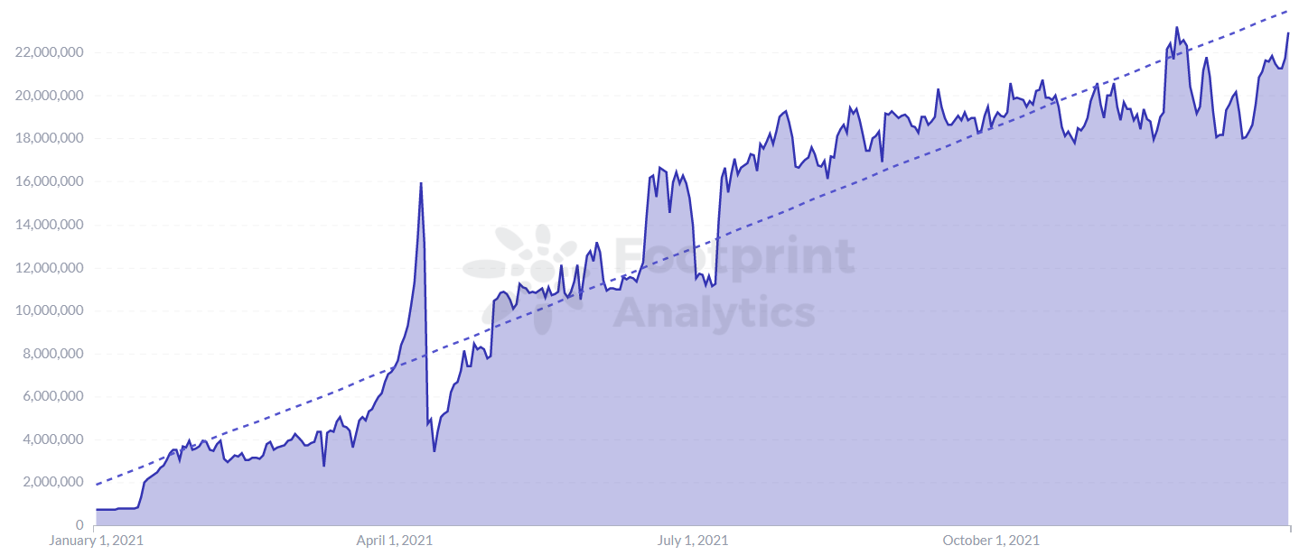 Kéo theo đó, GameFi trở thành lĩnh vực tăng trưởng nóng nhất trên thị trường tiền mã hóa, vượt qua cả DeFi. Các giao dịch liên quan đến GameFi đã tăng 2,934% trong năm nay. Trên thực tế, GameFi bắt đầu giai đoạn tăng trưởng bùng nổ vào tháng 3, kéo dài đến tháng 8/2021. Xuyên suốt quãng thời gian đó, các giao dịch trong lĩnh vực GameFi cũng trải qua hai đỉnh tăng trưởng trong giai đoạn này, vào ngày 9/4 và ngày 27/12.