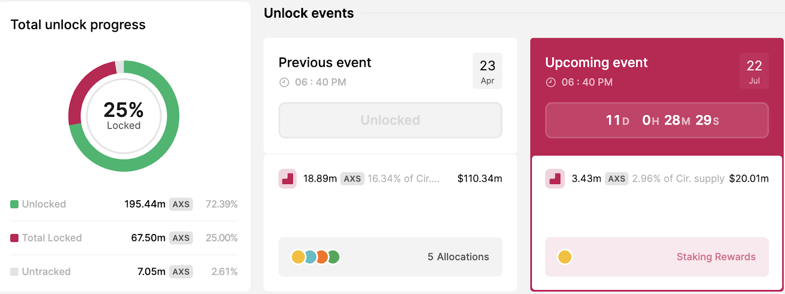 Axie Infinity đã lên kế hoạch để unlock token AXS vào ngày 22/7. Lúc đó, dự án sẽ phát hành ra thị trường 3.43 triệu AXS để làm phần thưởng cho những ai đã staking. Số token AXS này trị giá khoảng 2 triệu USD (thời điểm bài viết), và chiếm 2.96% nguồn cung đang lưu hành.