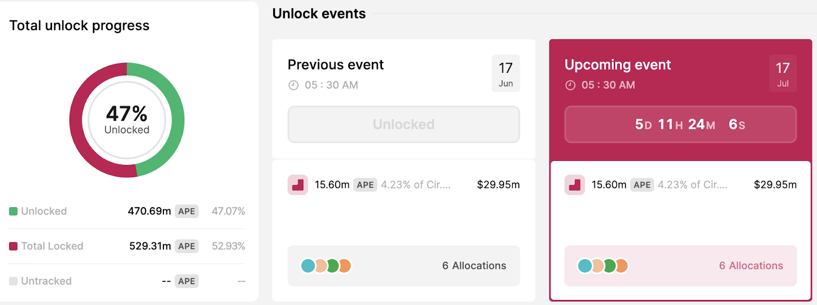 Tiếp đến là sự kiện unlock của ApeCoin (APE). Ngày 17/7, ApeCoin sẽ phát hành 15.60 triệu token để đưa vào lưu thông. Con số này tương đương với 29.95 triệu USD, và chiếm khoảng 4.23% nguồn cung lưu hành của APE.