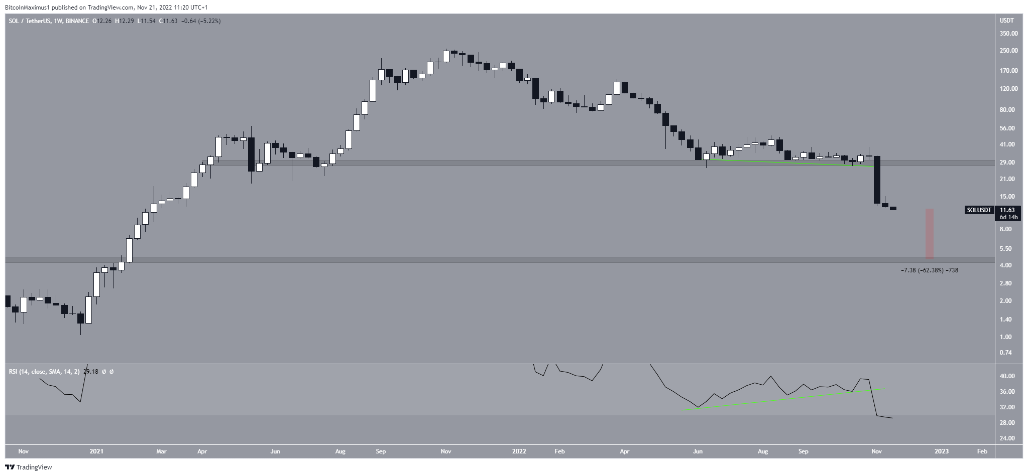 Sự cố này cũng khiến chỉ số RSI hàng tuần bị phá vỡ khỏi đường xu hướng phân kỳ giảm giá (màu xanh lá cây). Hành động này thường dẫn đến giá thấp hơn. Nếu xu hướng giảm tiếp tục, vùng hỗ trợ gần nhất sẽ là 4.4 USD. Đo lường từ mức giá hiện tại, giá SOL sẽ “cần” giảm thêm khoảng 62.4% nữa.