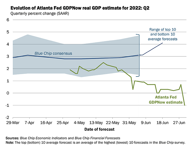 Theo ước tính do Cục Phân tích Kinh tế công bố, GDP thực tế trong Q1/2022 ở mức -1.6%. Mới đây nhất, mô hình GDPNow của FED tại Atlanta cho thấy tăng trưởng GDP thực tế Q2/2022 được ước tính ở mức -1% (đến ngày 30/6), chứng kiến mức giảm từ mức 0.3% vào ngày 27/6. Tương tự, theo một ước tính khác của IHS Markit về tăng trưởng GDP quý 2 đã giảm đều kể từ đầu tháng 6. Ước tính mới nhất là -0.7% vào ngày 30/6 so với mức hơn 2.0% vào đầu tháng 6.