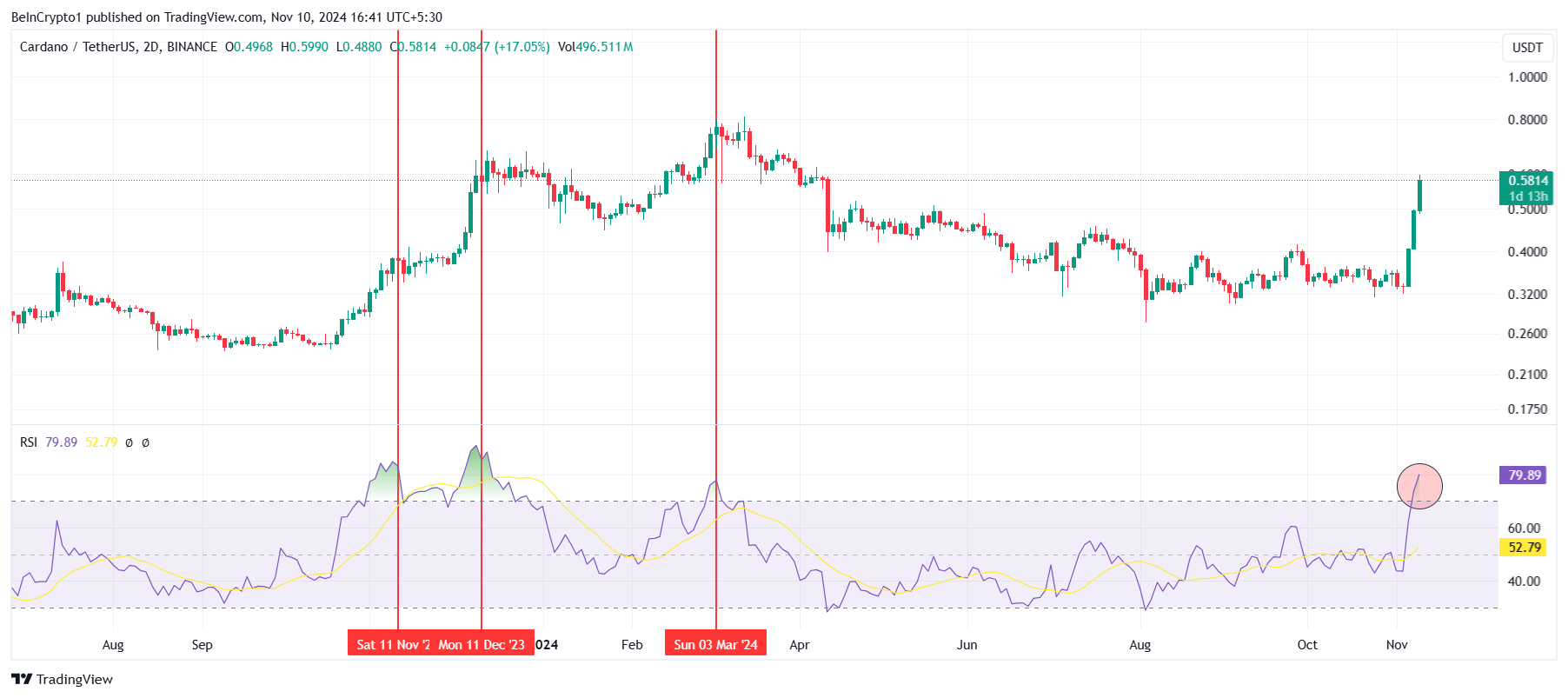 Về mặt kỹ thuật, đà tăng của Cardano được hỗ trợ bởi các chỉ số như chỉ số sức mạnh tương đối (RSI), hiện đang ở trong khu vực quá mua. Lịch sử cho thấy, một RSI quá mua thường kích hoạt các điều chỉnh ngắn hạn cho ADA, báo hiệu rằng một đợt giảm giá tạm thời có thể sắp xảy ra.