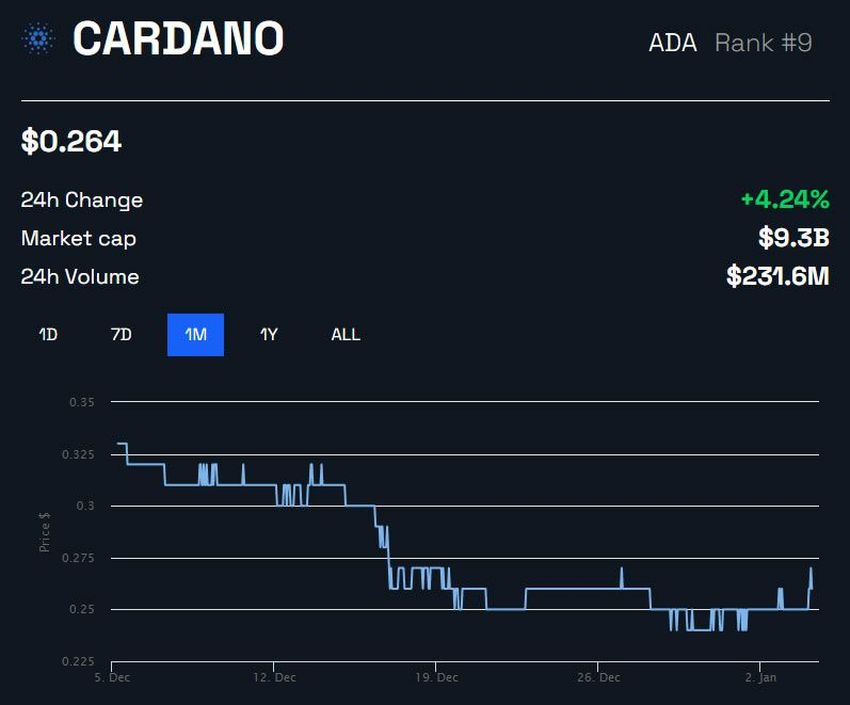 Giá ADA đã tăng mạnh trong ngày hôm nay, với mức tăng khoảng 6% trong 9 giờ qua. Do đó, giá ADA được giao dịch ở mức 0.264 USD tại thời điểm viết bài.