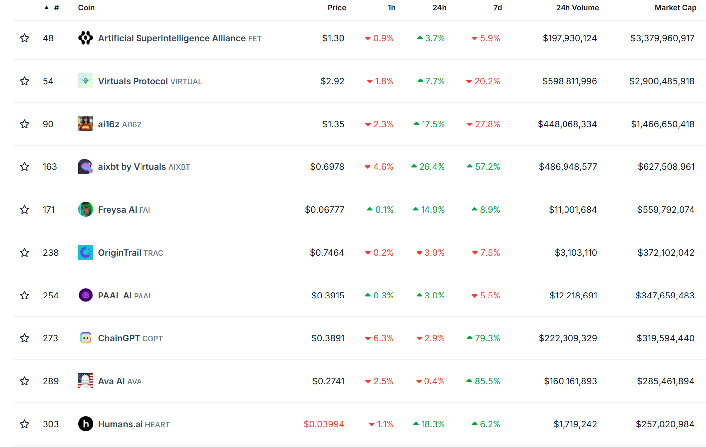 Tương tự, AI16z đã tăng 17.5% và đang giao dịch ở mức 1.35 USD tại thời điểm viết bài. Các token liên quan đến AI khác cũng có sự chuyển động tích cực. AIXBT tăng mạnh 28%, đạt khoảng 0.7 USD, trong khi token Artificial Superintelligence Alliance tăng 3.7% trong 24 giờ qua.