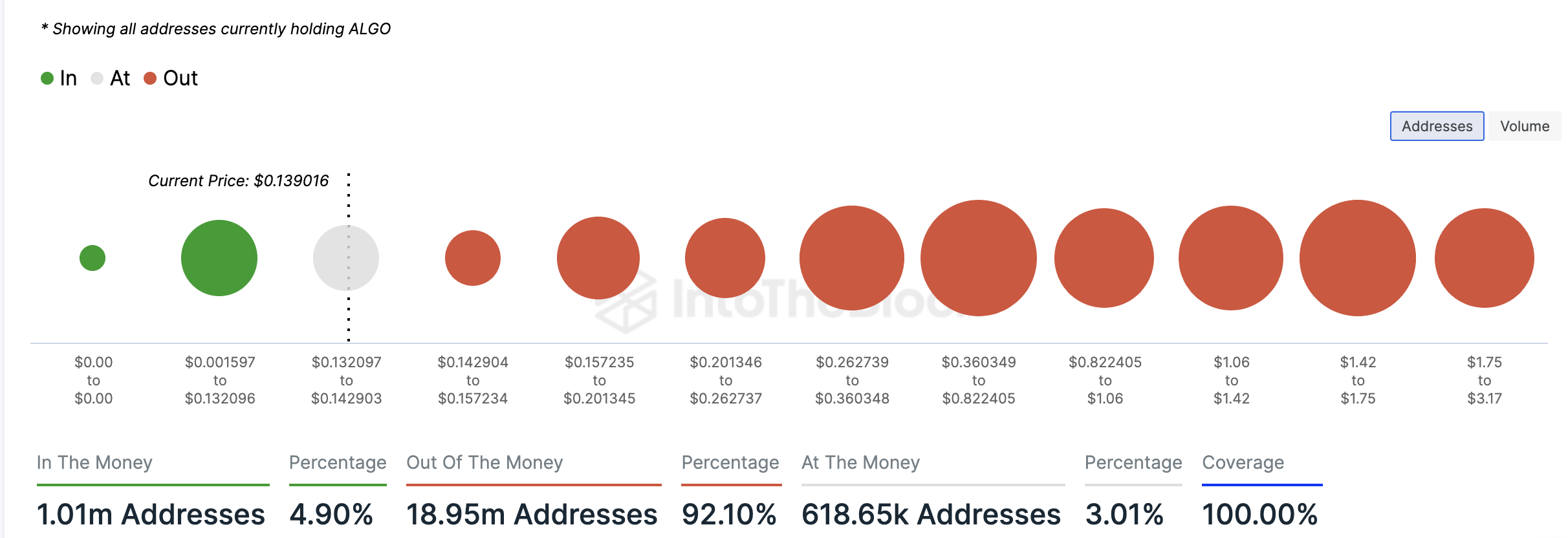 Ngược lại, chỉ có 1.01 triệu địa chỉ, tương đương với chỉ 5% tổng số người nắm giữ ALGO, đang giữ coin là có lợi nhuận.