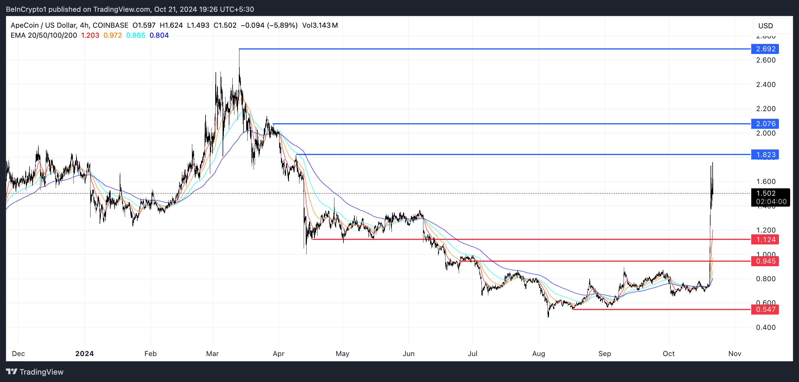 Nếu những hỗ trợ này không thành công, APE có thể giảm xuống thấp như 0.54 USD, đại diện cho một khả năng điều chỉnh 60% so với giá hiện tại. Phản ứng của thị trường đối với các phát triển sắp tới sẽ quan trọng trong việc xác định liệu APE có thể duy trì đà tăng của mình hay đối mặt với một đợt điều chỉnh đáng kể.