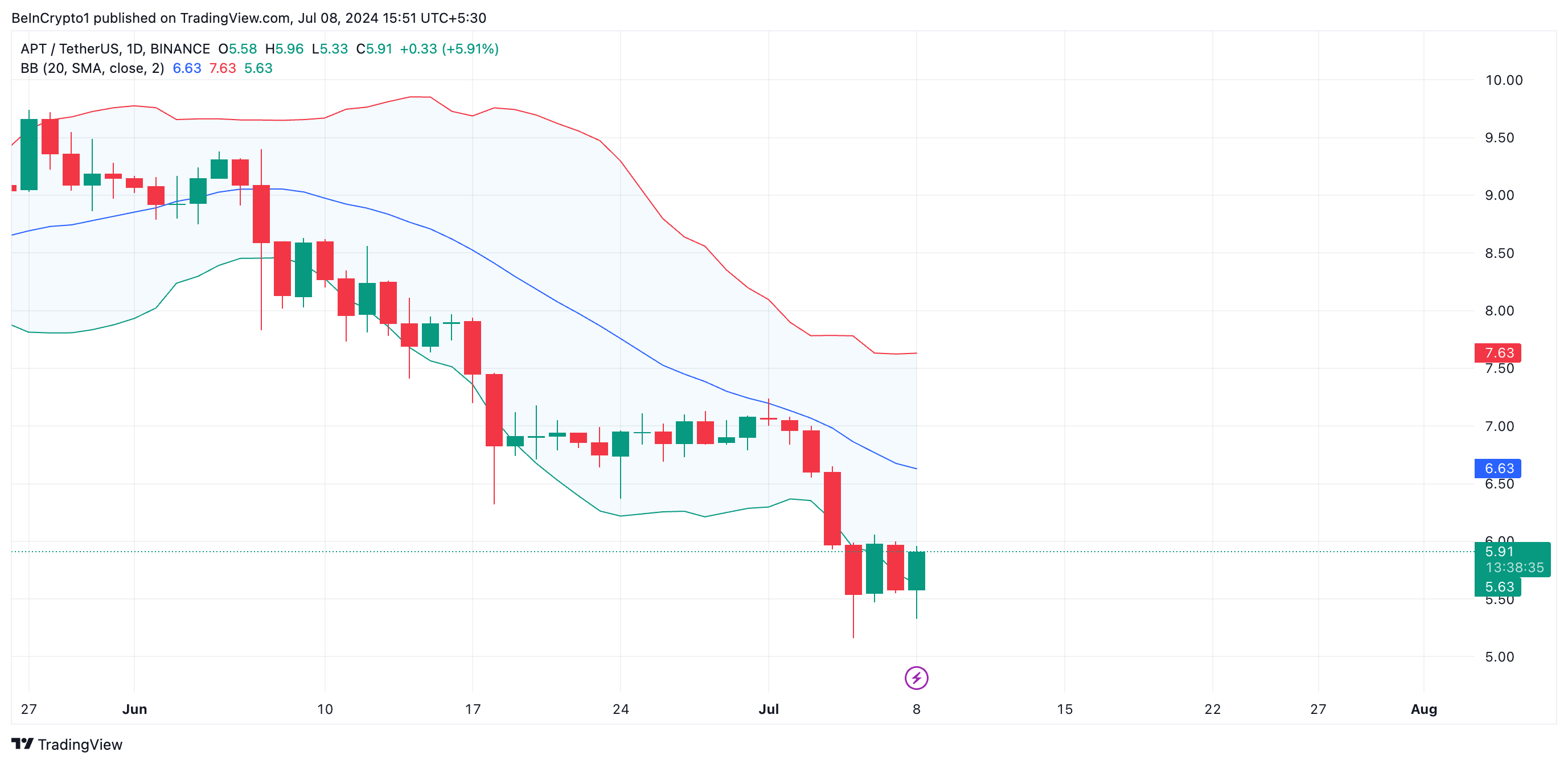 Được giao dịch ở mức 5.82 USD vào thời điểm bài viết, giá của Altcoin này đã giảm hơn 30%. APT vẫn đối mặt với nguy cơ biến động giá biên độ lớn, khi các dấu hiệu biến động đã xuất hiện và gia tăng.