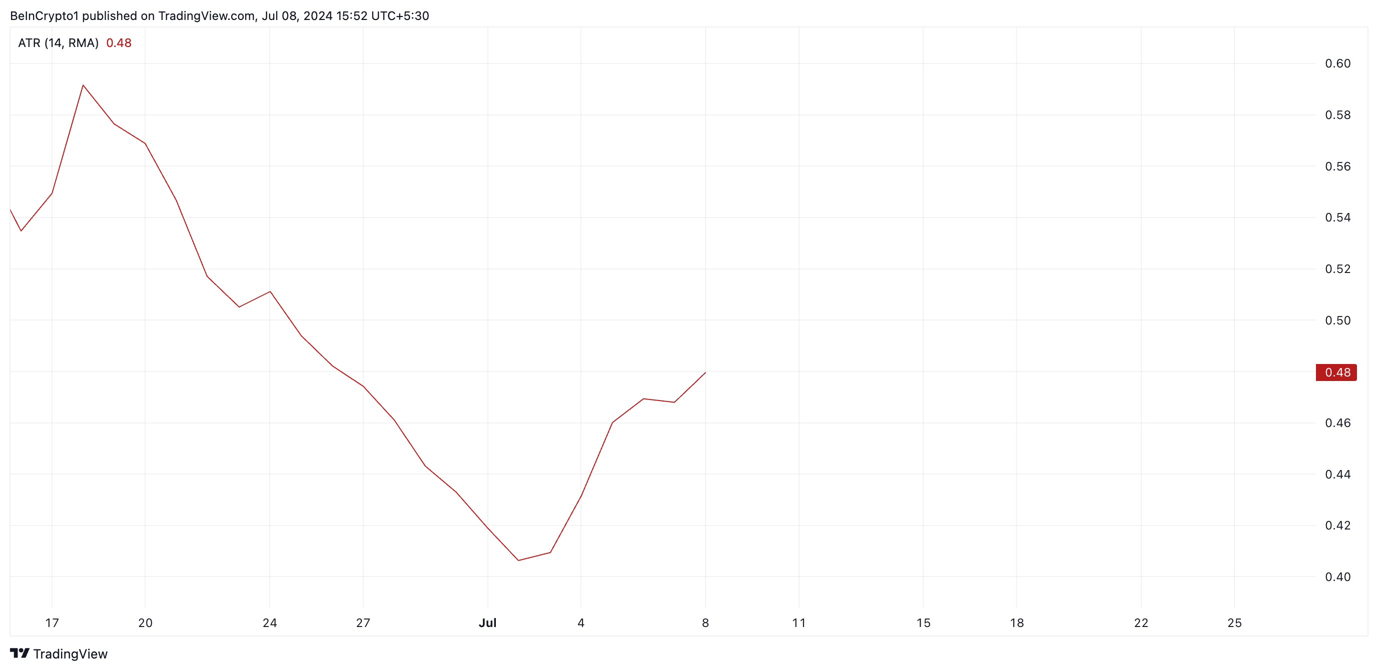 Chỉ báo này đo lường biến động thị trường bằng cách tính toán phạm vi trung bình giữa giá cao nhất và thấp nhất trong một số kỳ nhất định. Khi giá trị ATR tăng, nó cho thấy sự gia tăng biến động thị trường và ám chỉ khả năng sẽ xuất hiện biến động giá biên độ lớn, theo một trong hai hướng. Tại thời điểm viết bài, ATR của APT là 0.48 điểm, tức đã tăng liên tục từ ngày 01/07.