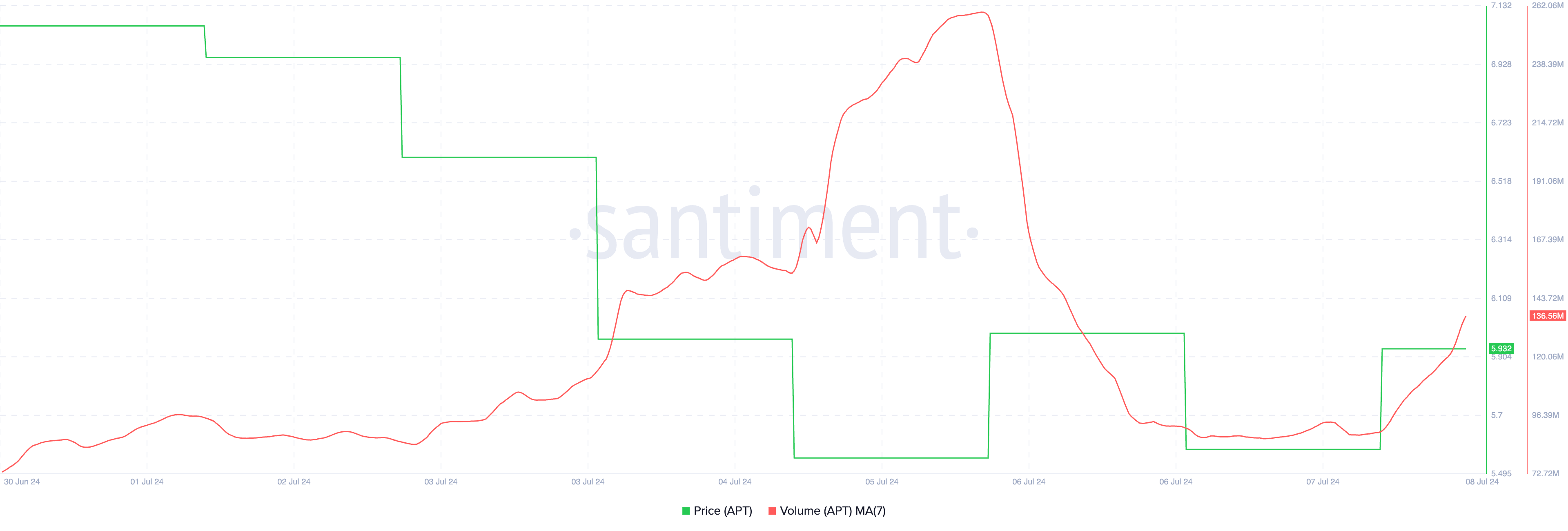 Mặc dù giá APT giảm mạnh, nhưng khối lượng giao dịch hằng ngày của APT tăng mạnh gần đây. Trong khi giá của token đã giảm 18% trong tuần qua, nhưng khối lượng giao dịch lại tăng 29% trong cùng thời gian đó.