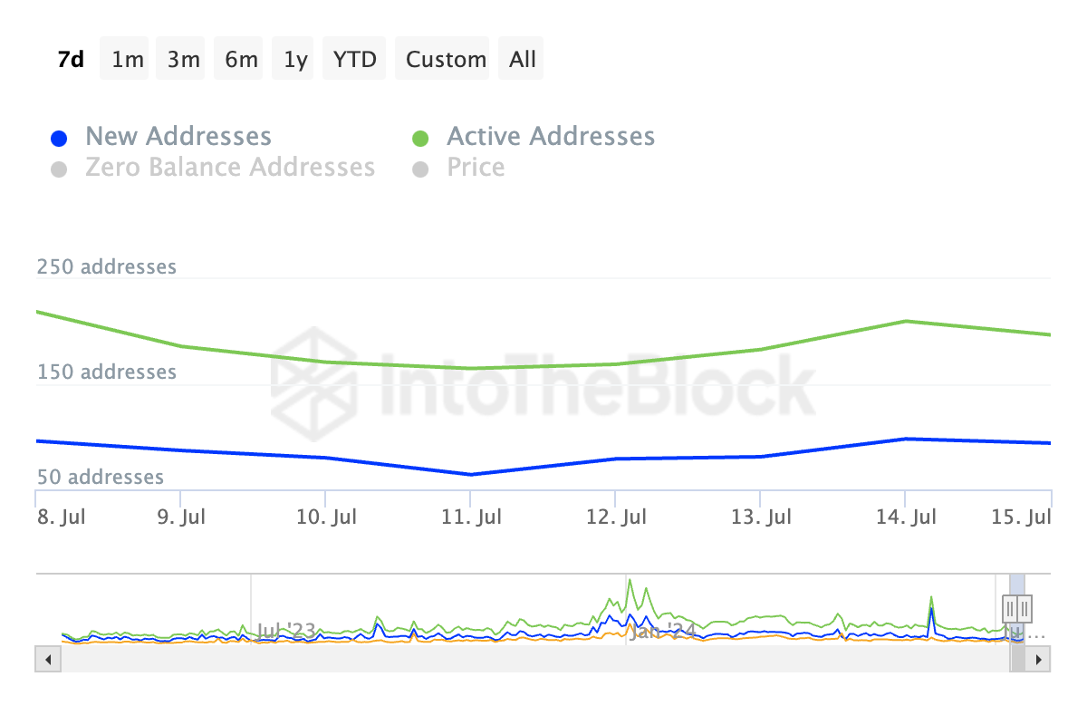 Nhu cầu mới đối với ARB giảm dần trong khi giá của nó lại đang tăng. Dữ liệu từ IntoTheBlock cho thấy trong bảy ngày qua, số lượng địa chỉ mới được tạo để giao dịch altcoin này đã giảm 2%.