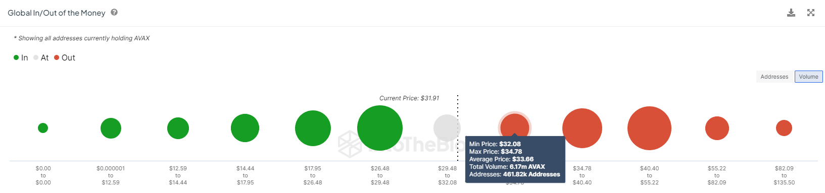 Điều này là bởi vì, theo chỉ số Global In/Out of the Money (GIOM), khoảng 11 triệu AVAX đã được mua trong khoảng từ 29 USD đến 34 USD. Lượng cung này, trị giá hơn 358 triệu USD, sẽ trở nên có lợi nhuận một khi giá của Avalanche vượt qua 34 USD. Tuy nhiên, khoảng 5 triệu AVAX đã đạt được lợi nhuận, khi giá đạt 32 USD, điều này cũng là một mối nguy tiềm ẩn.