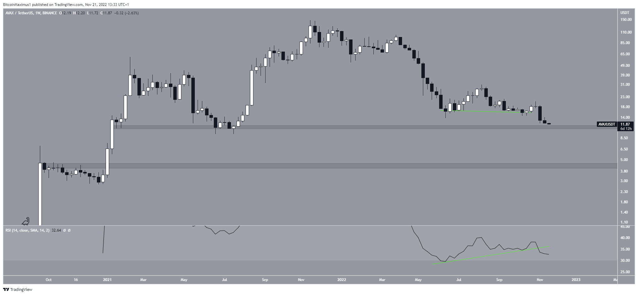 Phân tích kỹ thuật từ khung thời gian hàng tuần cho thấy giá AVAX đã giảm kể từ khi đạt mức cao nhất mọi thời đại (ATH) là 147 USD vào tháng 11/2021. Chuyển động đi xuống dẫn đến chỉ sau 1 năm, giá Avalanche chạm mức thấp nhất là 11.72 vào tháng 11/2022. Theo đó, với đà giảm này, giá Avalanche đã gần đạt đến vùng hỗ trợ chính ở mức 11 USD. Vùng này đã có từ đầu năm 2021.
