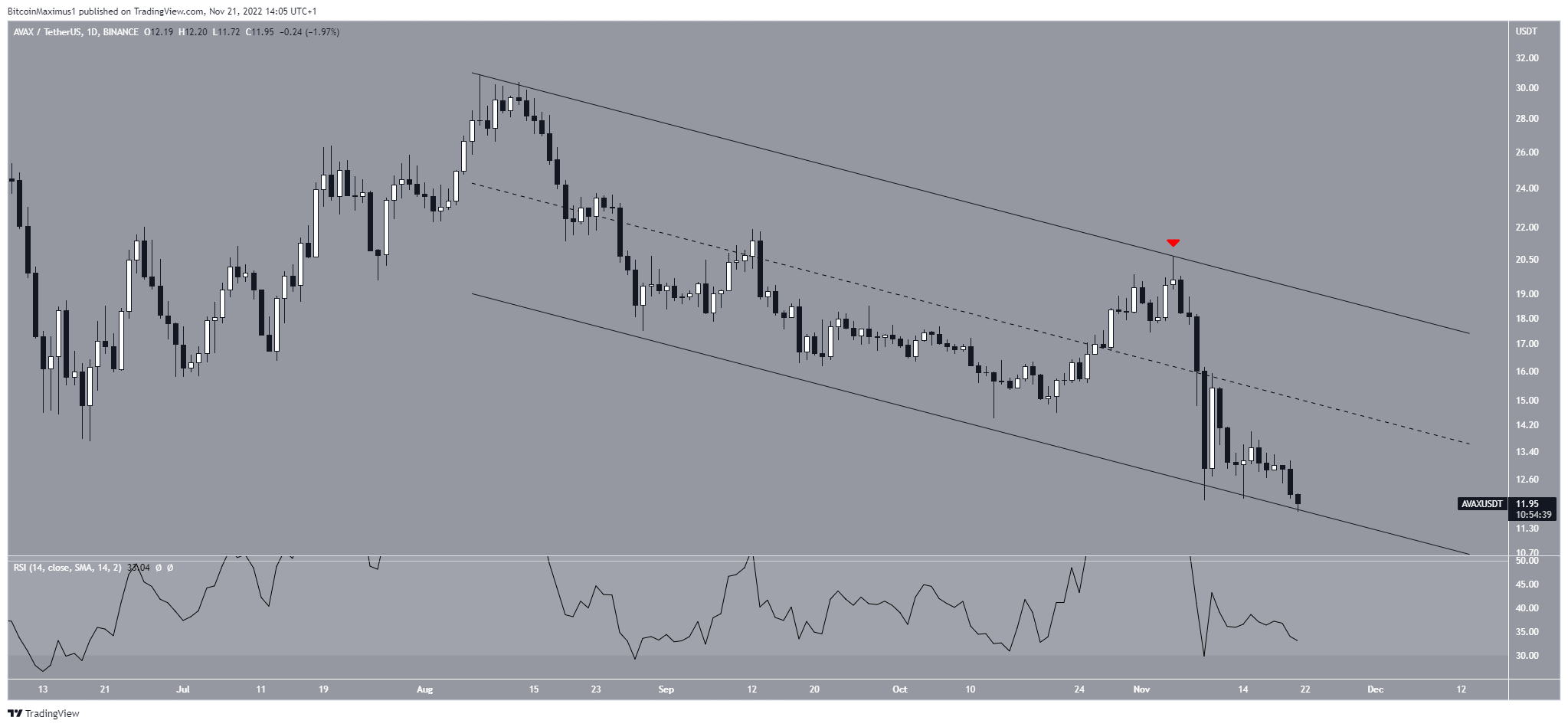 Giá Avalanche (AVAX) đã giảm xuống mức thấp mới hàng năm vào ngày 21/11. Nó đã gần đạt đến vùng hỗ trợ cuối cùng ở mức 11 USD.
