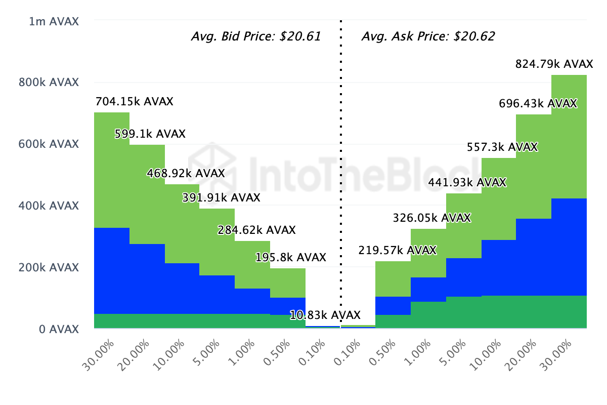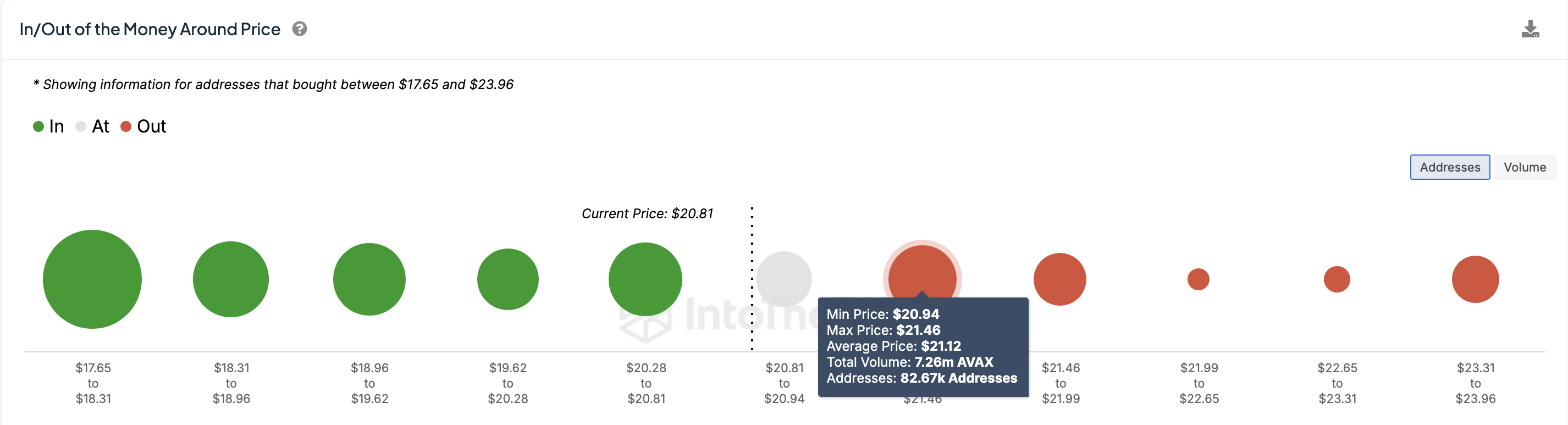 Điều quan trọng cần lưu ý là, tại mức giá nào số lượng địa chỉ bán ra (Out) nhiều hơn sẽ tạo thành kháng cự, trong khi mức giá có số lượng địa chỉ mua vào (In) nhiều hơn sẽ trở thành hỗ trợ. Đối với Avalanche, 82,670 địa chỉ đã mua 7.26 triệu token với giá trung bình là 21.12 USD. Nhóm này đang lỗ, và giữ ở mức lỗ chưa thực hiện.