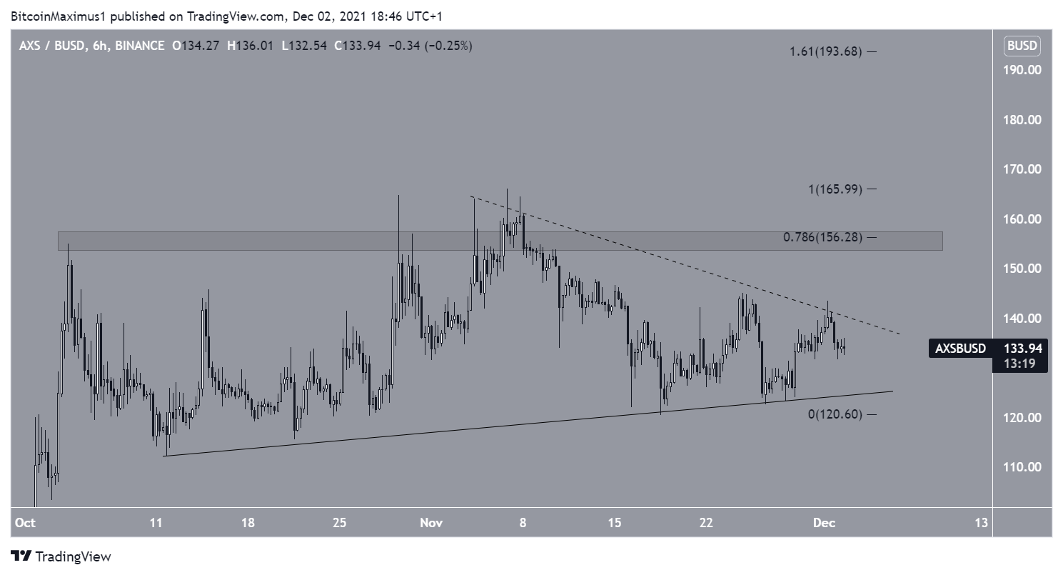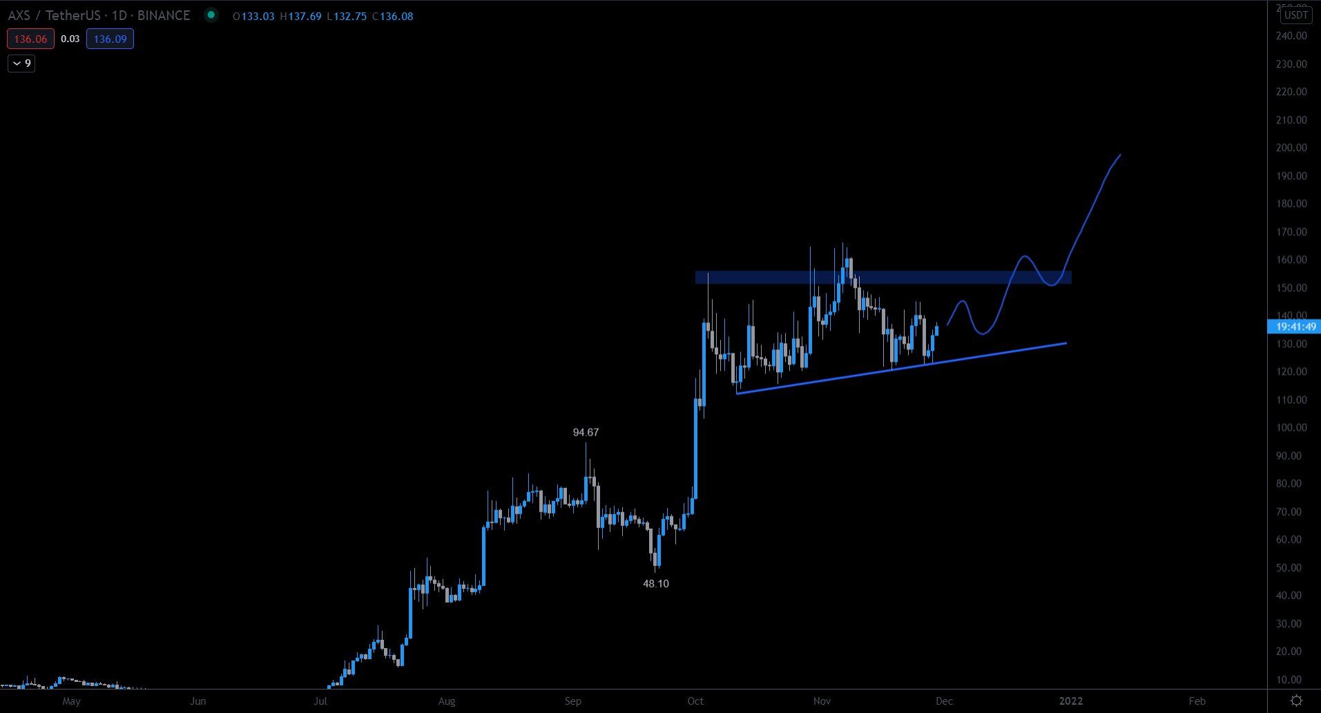 Kể từ ngày 18 tháng 10, giá AXS biến động trong biên độ từ 110 đến 160 USD, trong một kênh giá song song tăng dần. Vào ngày 6 tháng 11, giá AXS đã bị từ chối bởi đường kháng cự của kênh (biểu tượng màu đỏ) và quay đầu giảm kể từ đó.